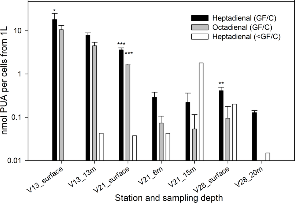 Production of PUA by cells from 1 L of seawater collected at different depths from different size fractions. All values are average ± standard deviation (n = 3), except for the heptadienal < GF/C (white bars), where n = 1. Statistical evaluation was only performed for heptadienal GF/C and octadienal GF/C. The values that are significantly different from the other depth at the same station are indicated by stars (t-test was used for the comparison of data from two different depth at V13 as well as V28, one-way ANOVA followed by Holm-Sidak comparison was used for measurements at three different depths at station V21 * p < 0.05, ** p < 0.01, *** p < 0.005). Note the logarithmic scale.
