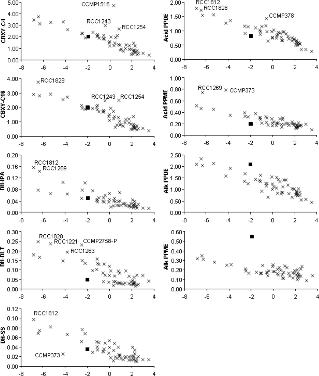 Activities of each strain for each enzyme (arbitrary units) plotted against first principle component (PC1) scores for each strain (x axis) from a PCA of normalised activities for all enzymes (×). Selected individual strains are labelled. The virally infected strain (CCMP2090inf) is indicated by ▪. Enzyme activities are carboxylesterase with C4 substrate (CBXY-C4); carboxylesterase with C16 substrate (CBXY-C16); E.C.1.1.1-type dehydrogenase with isopropyl alcohol substrate (DH-IPA); E.C.1.1.1-type dehydrogenase with DL-threonine substrate (DH-DLT); E.C.1.3.1-type dehydrogenase with sodium succinate substrate (DH-SS); alkaline phosphodiesterase (Alk PPDE); acid phosphodiesterase (Acid PPDE); alkaline phosphomonoesterase (Alk PPME); and acid phosphomonoesterase (Acid PPME).
