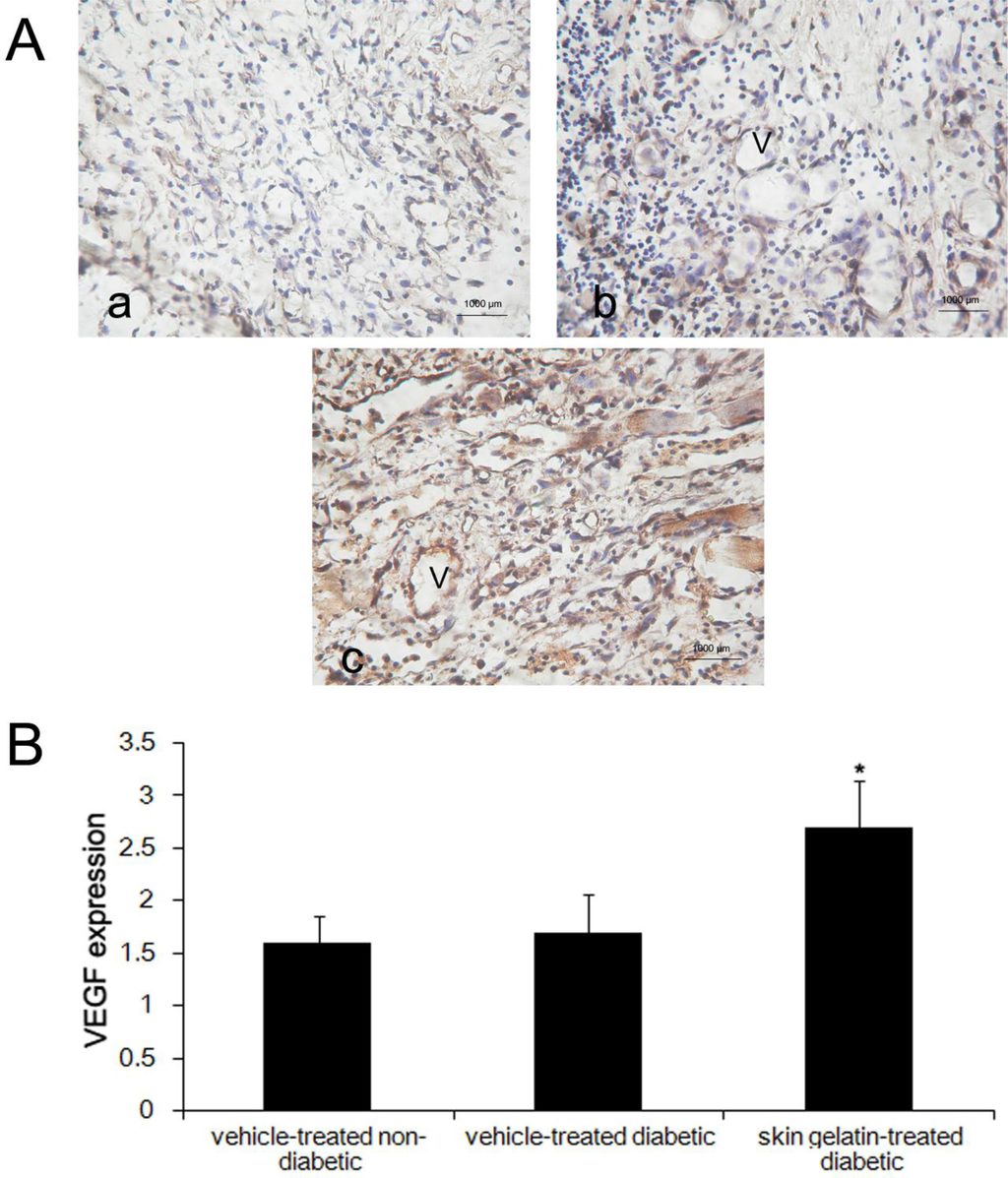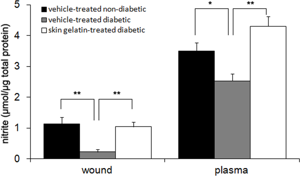 | Vehicle-treated non-diabetic (n = 8) | Vehicle-treated diabetic (n = 8) | Skin gelatin-treated diabetic (n = 8) | P-value (between groups after treatment) | ||||
