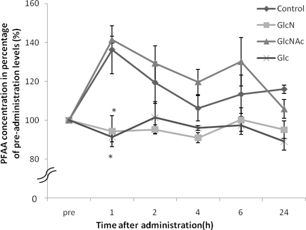 Changes in plasma total free amino acid (PFAA) concentration in dogs after each saccharide (GlcN, GlcNAc, and Glc) administration. Plasma total free amino acid concentration pre-administration was considered as 100%. *: p < 0.05, compared to the level of the control at each hour. Data represent the mean ± SE of three dogs in each group.