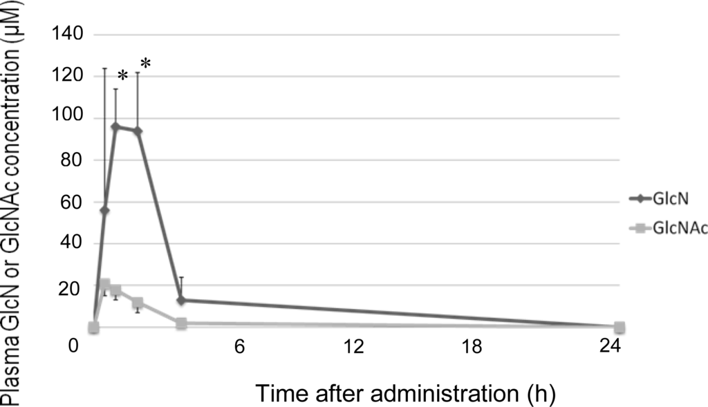 Changes in plasma GlcN or GlcNAc concentration after oral GlcN or GlcNAc administration. All data indicate mean ± S.D. *: P < 0.05 compared to GlcN group.