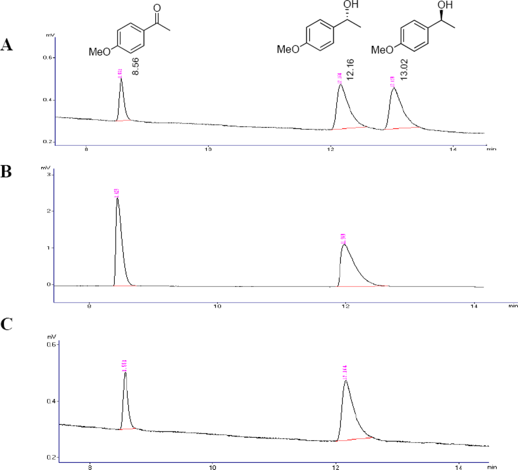 Analysis using GC. (a) Sample containing a mixture of (RS)-1-(4-methoxyphenyl)ethanol and 4-methoxyacetophenone. (b) Sample from oxidation reaction of (RS)-3 mediated by Arthrobacter sp. (c) Sample from oxidation reaction of (RS)-3 mediated by Flavobacterium sp.