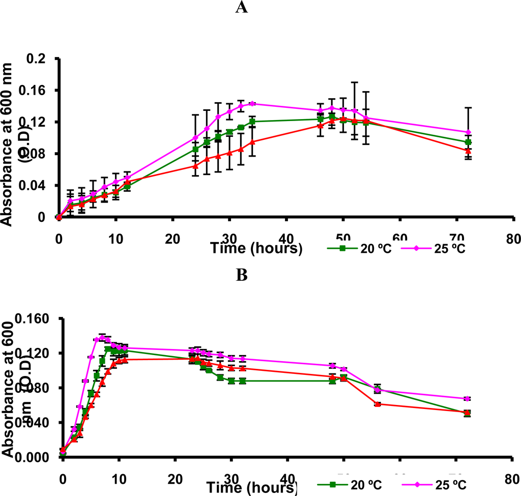 Growth curve experiments were performed with Erlenmeyer flasks (2000 mL) containing 1000 mL of sterilized culture media and 100 mL of inoculated cultures. The mixture was incubated in an orbital shaker (160 rpm, 15, 20 and 25 °C). Samples of culture (1 mL) were periodically removed at 120 min intervals and the growth was estimated spectrophotometrically (and expressed as optical density [O.D.]) at 600 nm with a Biospectro model sp-220 spectrophotometer using cells with a 1 cm light path.