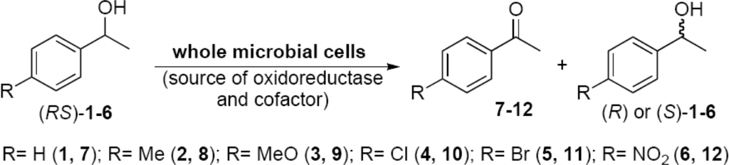 Enantioselective oxidations of alcohols, para-substituted (RS)-1-phenylethanols, were used to evaluate the enzyme activity (oxidoreductases, OXRED) of 232 microorganisms psychrophile/psychrotroph previously isolated (Scheme 1).