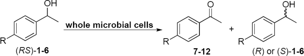 In reactions mediated by bacterium HK1D10 cells, in which the R substituent was halogen, low conversions (∼1%) and no selectivity were observed (Entries 34 and 35). In general, all microorganisms produce oxidoreductases with preferential oxidation for the (S)-enantiomer from the (RS)-alcohols (1–6)