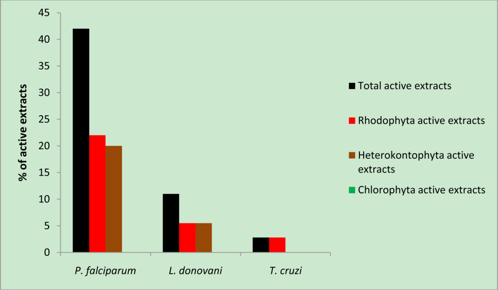 Almost all the marine macrophytes species tested in the current study showed activity against at least one protozoan. Some of them may be promising sources for further bio-guided isolation of new active components. Most of these components are probably apolar compounds. The most interesting species, in terms of antiplasmodial activity and selectivity, is the red algae M. stellatus. Bioguided fractionation is underway.