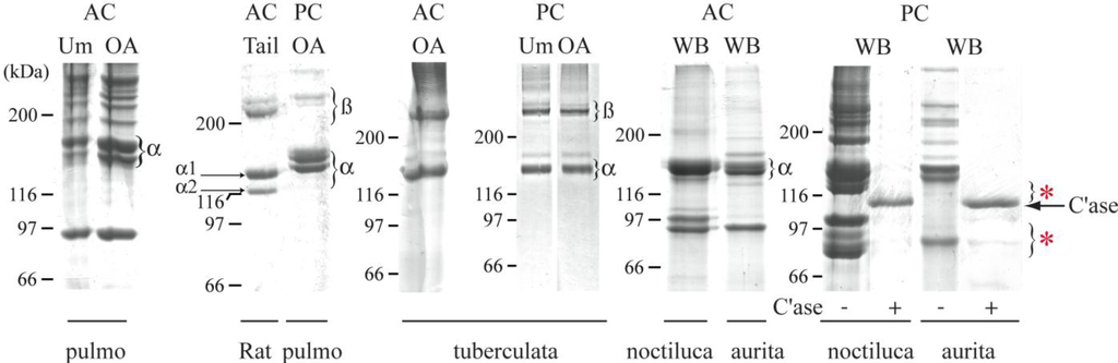 SDS-PAGE analysis of jellyfish collagens. Acid-soluble (AC) and pepsinized (PC) collagens of R. pulmo (pulmo), C. tuberculata (tuberculata), P. noctiluca (noctiluca) and A. aurita (aurita) were loaded on 6% polyacrylamide gels. AC tail rat type I collagen was used as fibrillar collagen control. The jellyfish fibrillar α chains (α) and dimers of cross-linked α chains (β) were indicated. Jellyfish collagens have been extracted from umbrella (Um), oral arms (OA) or whole body (WB). The red asterisks denote putative degraded products. C’ase: collagenase. The positions of molecular mass markers (kDa) are indicated on the left of the gels.