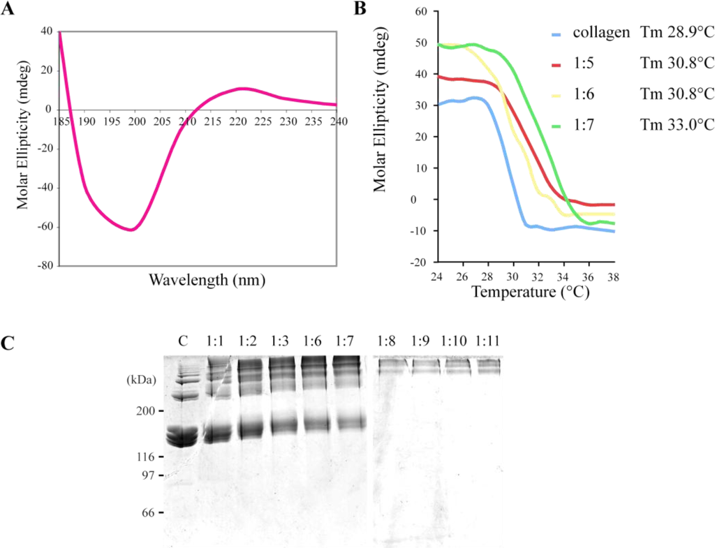 Melting temperature of pepsinized and EDC cross-linked R. pulmo collagens. (A) Circular dichroism spectra recorded at 25 °C for pepsinized collagen; (B) Thermal transition curves of pepsinized or EDC cross-linked (1:5 to 1:7 collagen/EDC ratios, w/w) collagens (300 μg/mL) were monitored by circular dichroism at 220 nm through 0.5 °C/min ramps (from 22 to 40 °C). Melting temperature (Tm) for each condition is indicated in the legend; (C) SDS/PAGE analysis of EDC cross-linked jellyfish collagens. Different collagen/EDC ratios (w/w) were loaded and compared to untreated collagen (C, control).