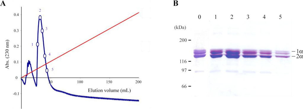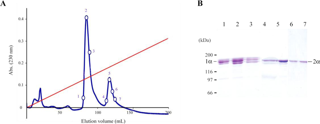 Analysis of denatured R. pulmo collagen. (A) CM-cellulose chromatography of denatured collagen. Denatured collagen in 0.02 M sodium acetate was subjected to a CM-cellulose chromatography. Elution was realized with a 0–0.15 M linear gradient of NaCl (red line); (B) SDS-PAGE of fractions numbered in (A). The migration of R. pulmo collagen chains is indicated by 1α and 2α.