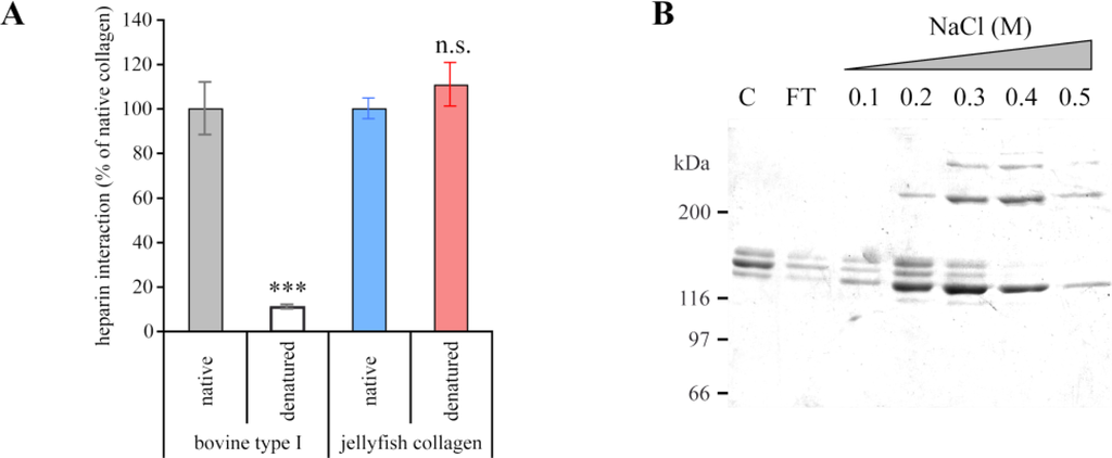 Native and denatured R. pulmo collagens interact with heparin. (A) Solid phase assays were used to analyze heparin/collagen interactions. Bovine pepsinized collagen was used as a positive control. Native or denatured bovine or jellyfish pepsinized collagens were coated at 5 μg/mL. (***) p < 0.001; (n.s.) non significant; Student’s t-test; (B) Eluted fractions from heparin-affinity chromatography were analyzed by SDS-PAGE. C, Jellyfish collagen before chromatography; FT, flow-through fraction.