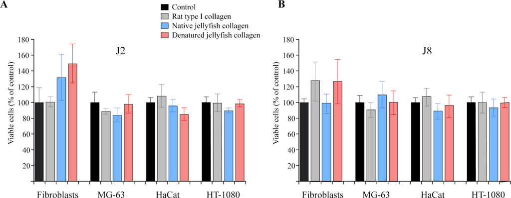 In the perspective to use R. pulmo as a natural marine biomaterial, its cytotoxicity and its effect on cell adhesion were investigated. In order to detect a possible toxicity of jellyfish collagen, human cells originating from different tissues were cultured for two or eight days on R. pulmo native or denaturated collagen. For all the cell lines tested (fibroblastic, epithelial, osteoblastic and fibrosarcoma), the amount of viable cells on jellyfish collagen-coated wells was not significantly different from rat type I collagen or from uncoated wells (Figure 6). These results are in agreement with the study of Song et al. [24], performed with fibroblasts, chondrocytes, endothelial and smooth muscle cells. Taken together, these data confirm the harmlessness of jellyfish collagens in the experimental conditions used.