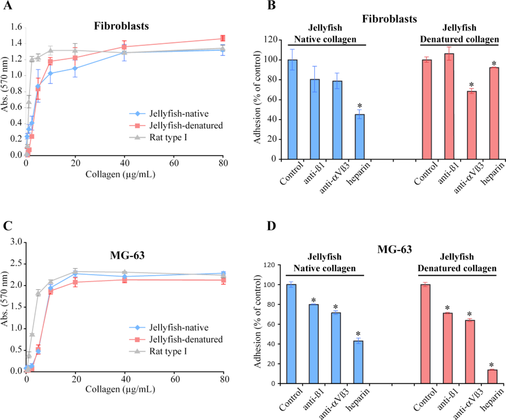 Cellular receptors of R. pulmo collagens. Dose-response profiles of human fibroblasts (A) and MG-63 (C) to native rat type I, and native and denatured jellyfish collagens from R. pulmo. Fibroblast (B) or MG-63 cell (D) adhesion to native or denatured jellyfish collagen in the presence of anti-integrin antibody, heparin, or without inhibitor (control). Cell adhesion was quantified by a colorimetric assay using crystal violet. Values shown are the mean of triplicates minus non-specific binding on BSA, and statistical analyses were carried out from three independent experiments. (*) p < 0.05, Student’s t-test.
