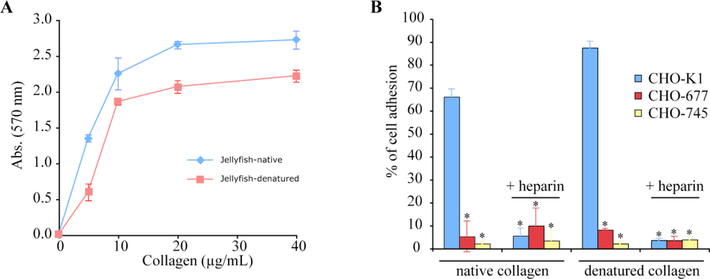 Adhesion of CHO cells to R. pulmo collagens: (A) Dose-response profiles of CHO-K1 cells to native and denatured jellyfish collagens; (B) Adhesion of CHO-K1 or of the mutants (CHO-677 and CHO-745) to native or denatured jellyfish collagens in the presence or absence of heparin. Statistical analyses were performed from three independent experiments. (*) p < 0.005, Student’s t-test.