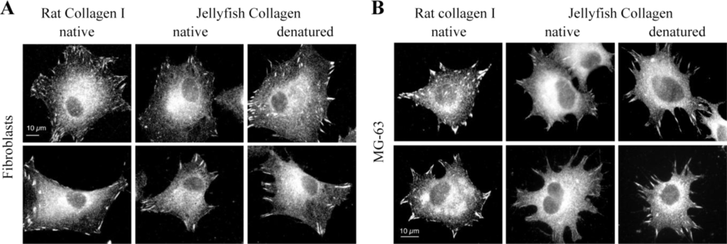 All collagen solutions were aliquoted and stored at −20 °C until use. Protein concentrations were determined using Quantipro BCA kit (Sigma). Denatured jellyfish collagen was obtained by heating the solutions (60 °C, 20 min). Acid-soluble rat type I collagen was used as a control, and was purified as previously described [40]. Bovine pepsinized collagen was purchased from BD Bioscience.