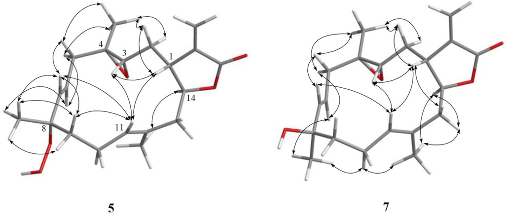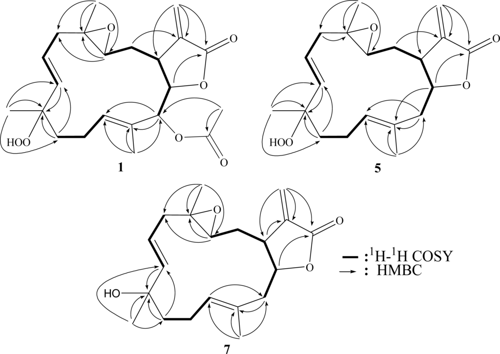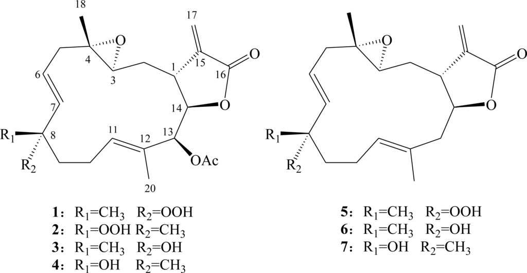 - Ahmed, AF; Wen, Z-H; Su, J-H; Hsieh, Y-T; Wu, Y-C; Hu, W-P; Sheu, J-H. Oxygenated cembranoids from a Formosan soft coral Sinularia gibberosa. J Nat Prod 2008, 71, 179–185. [Google Scholar]