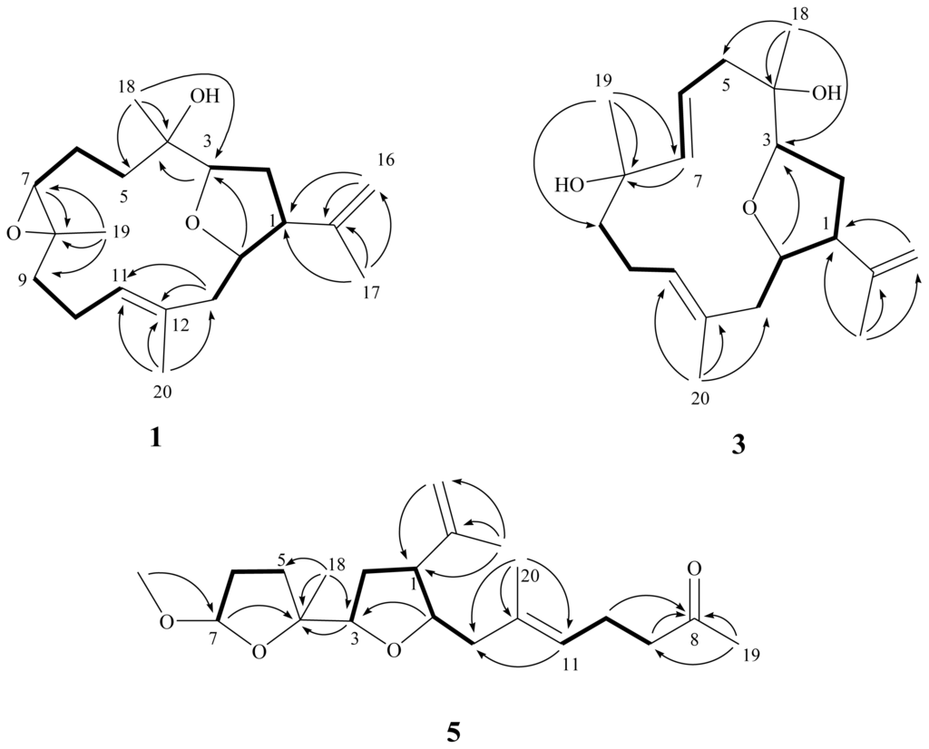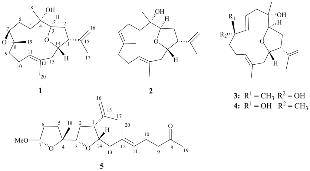 It is worth noting that metabolites 1–4 are rare cembranoids possessing a tetrahydrofuran moiety with a 3,14-ether linkage, which has been discovered previously in the soft coral Sinularia gibberosa [5,21]. In addition, 5 is the first secocembrane possessing two tetrahydrofuran moieties with 3,14- and 4,7-ether linkages. Our study thus adds the structure diversity of cembranoidal natural compounds.