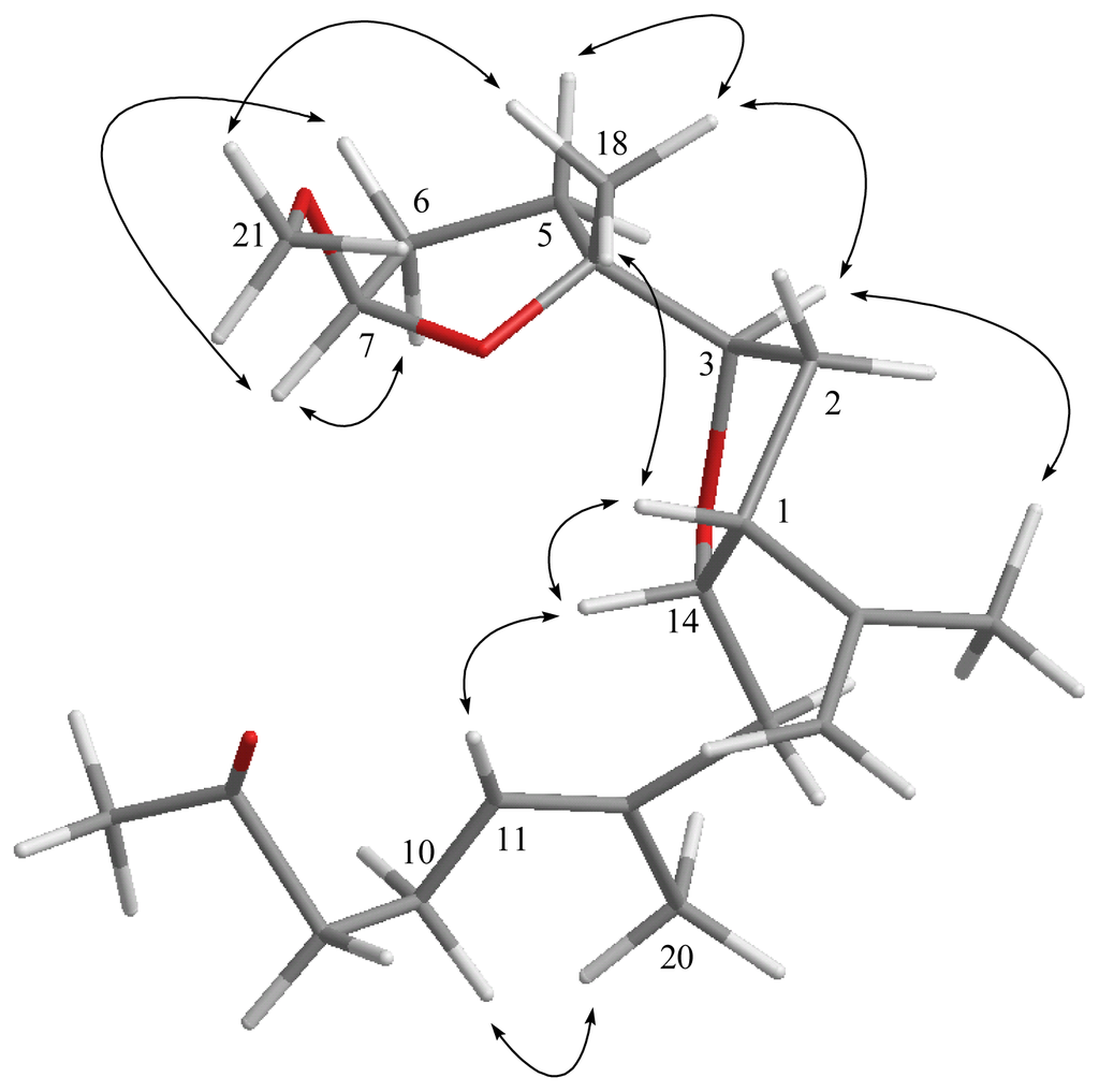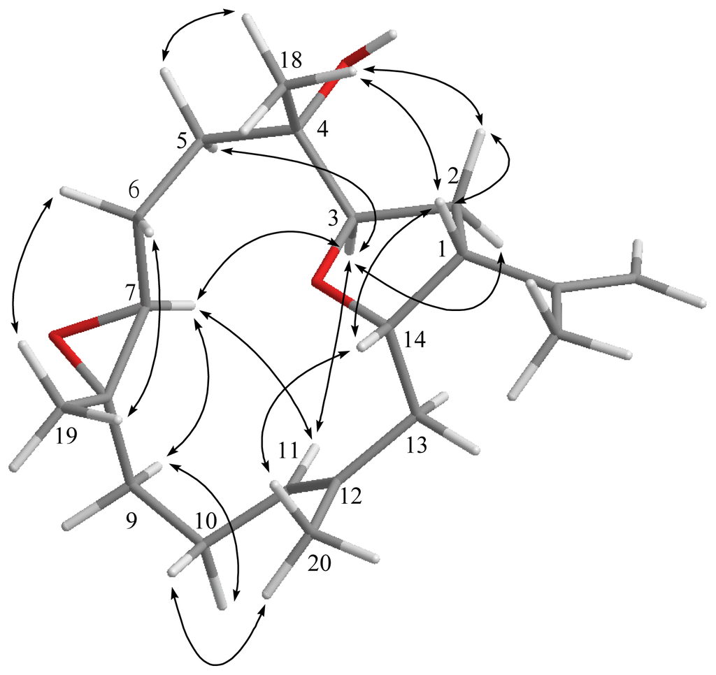 The relative configuration of 1 elucidated mainly by NOESY spectrum was compatible with that of 1 offered by using the MM2 force field calculations which suggested the most stable conformations as shown in Figure 2. In the NOESY spectrum, it was found that H-1 (δ 2.77, dt, J = 8.8, 8.0 Hz) showed NOE interactions with H-14 and H3-18 (δ 1.15, s); therefore, assuming the β-orientation of H-1, H-14 and H3-18 should also be positioned on the β face. One of the methylene protons at C-2 (δ 1.92) exhibited NOE correlations with H-1 and was characterized as H-2β, while the other (δ 2.16) was assigned as H-2α. NOE correlations observed between H-2α and H-3 (δ 3.98, dd, J = 9.6, 4.4 Hz), and H-3 and H-7 (δ 3.27, d, J = 6.8 Hz), reflected the α-orientations of both protons H-3 and H-7. Also, H3-19 was found to interact with H2-6, but not with H-7, revealing the trans geometry of the trisubstituted epoxide. Furthermore, the NOE correlations observed H3-20 and H-10 (δ 2.21), but not with H-11, reflected the E geometry of double bond at C-11. On the basis of the above findings and other detailed NOE correlations (Figure 2), the relative structure of 1 was determined.
