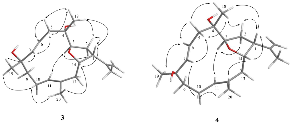 Lobophylin C (3) showed a protonated molecule peak [M + Na]+ at m/z 343.2248 in the HRESIMS, corresponding to the molecular formula C20H32O3 and five degrees of unsaturation. The IR spectrum showed the presence of hydroxy (3377 cm −1 ) group. 1H and 13C NMR spectroscopic data (Tables 1 and 2) of 3 showed the structural unit of a 3,14-oxa-bridged tetrahydrofuran, too. 1H-1H COSY and HMBC (Figure 1) further revealed that 3 possesses a 1,2-disubstituted double bond (δ 118.9 and 142.7, each CH) at C-6 and C-7 and a quaternary oxycarbon at C-8 (δ 73.6, C). On the basis of the above observations, and by the assistance of additional 2D NMR (1H-1H COSY and HMBC) correlations, it was possible to establish the planar structure of 3 as illustrated in Figure 1. The relative configurations of the five chiral centers at C-1, C-3, C-4, C-8 and C-14 in 3 were thus determined on the basis of NOE correlations (Figure 3). By careful inspection on the NOESY spectrum of 3, it was found that one proton (δ 2.40) of H2-5 showed NOE interaction with both H3-18 and H-7, and H-7 was NOE correlated with H3-19. Therefore, H3-18 and H3-19 are situated on the same β-face. Furthermore, NOESY spectrum showed correlation of H3-20 with one proton (δ 2.19) of CH2-10, but not with H-11, revealing the E-configurations of the 11,12-trisubstituted double bond. The above finding, together with J values for both H-6 (15.2 Hz) and H-7 (15.6 Hz), confirmed the E-configuration of the 6,7-double bond. Further NOE analysis revealed that 3 possessed the same configurations at C-1, C-3, C-4 and C-14, as in compound 1 (Figure 3). Based on the above results, the structure of 3 was established.
