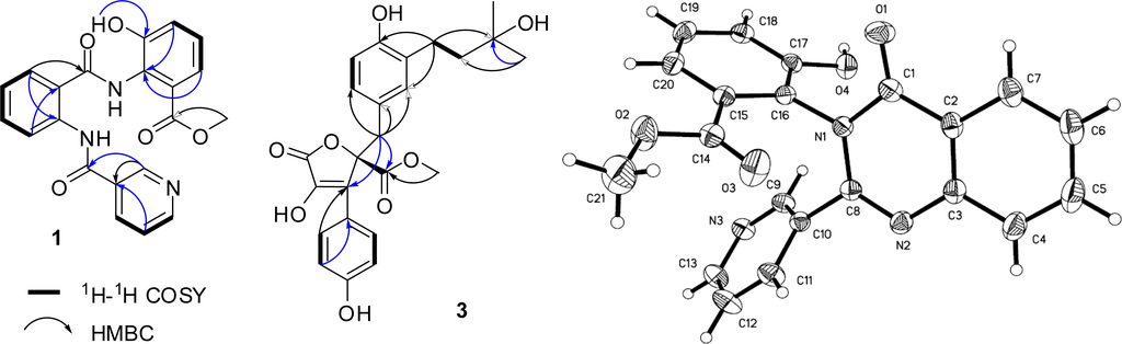 The key COSY and HMBC correlations for compounds 1 and 3, and the final X-ray drawing of compound 2.