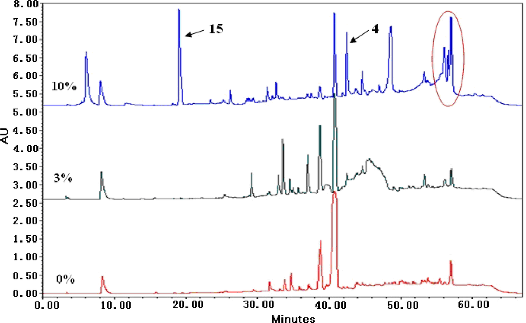 HPLC profiles of secondary metabolites from A. terreus PT06-2 cultured in different salt conditions (0%, 3% and 10%, respectively). Peaks circled were red pigments (HPLC eluent: 0–60 min, 5–100% CH3OH; flow rate: 1 mL/min).
