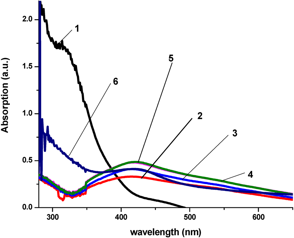 Kinetic of reaction process of AgNPs production using Magnolia grandiflora water extract as reduction agent. (1) Magnolia leaves water extract in sterile distilled water. (2) AgNO3(10−3 M) + Magnolia aqueous extract (3 mL) after 3 min of reaction. (3) AgNO3 (10−3 M) + Magnolia water extract (3 mL) after 5 min of reaction. (4) AgNO3 (10−3 M) + Magnolia water extract (3 mL) after 10 min of reaction. (5) AgNO3 (10−3 M) + Magnolia water extract (3 mL) after 20 min of reaction. (6) Commercial Ag Colloidal solution—10 ppm concentration.