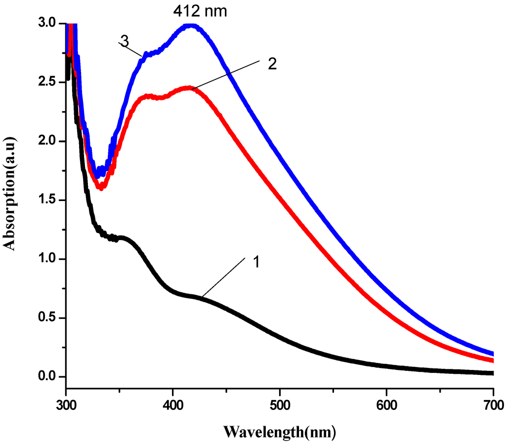 Kinetic of reaction process of AgNPs production using Geranium leaf water extract as reduction agent (1) 1 min after reaction, (2) 3 min after reaction, (3) 5 min after reaction.