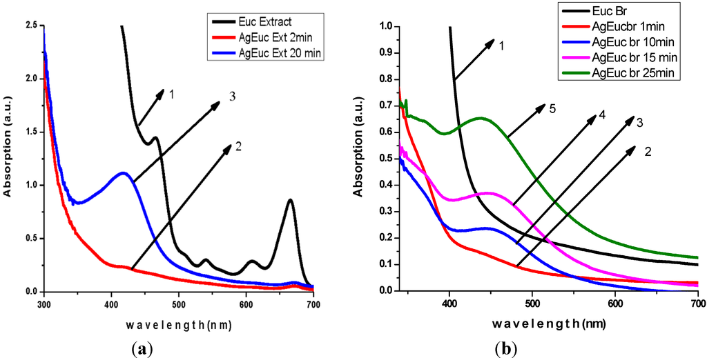 Kinetic of reaction process of AgNPs production using Eucalyptus ethanol extract (a) and water extract (b) as reduction agent.