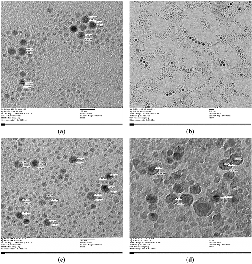 TEM Images of AgNPs produced by Eucalyptus (a); (b) and Aloe plant (c), (d).