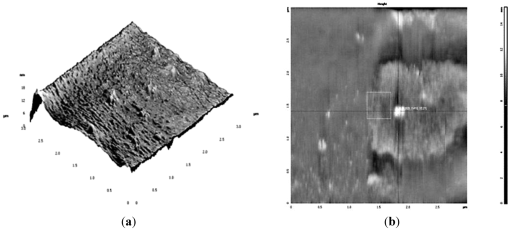 AFM images of AgNPs produces by Geranium water extract. (a) 3-D image of Ag nanoparticles produced by Geranium water extract; (b) Estimation of nanoparticles size by decreasing the scanning range (3 µm), the size of AgNPs as shown on the image is ~15.2 nm.