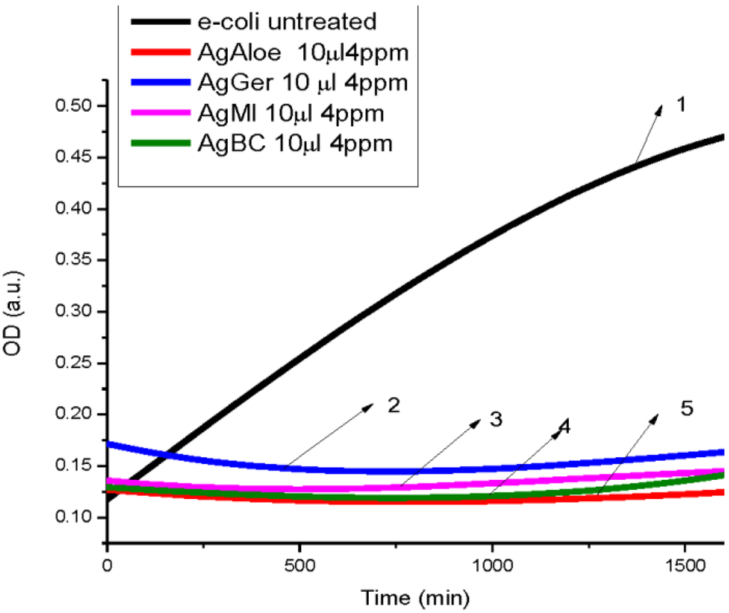 Dependence optical density on time of E. coli (1) Untreated E. coli. (2) Treated with 10 µL, 4 ppm AgNPs produced by Geranium. (3) Treated with 10 µL, 4 ppm AgNPs produced by Magnolia. (4) Treated with 10 µL, 4 ppm AgNPs produced by black cohosh. (5) Treated with 10 µL, 4 ppm AgNPs produced by Aloe.