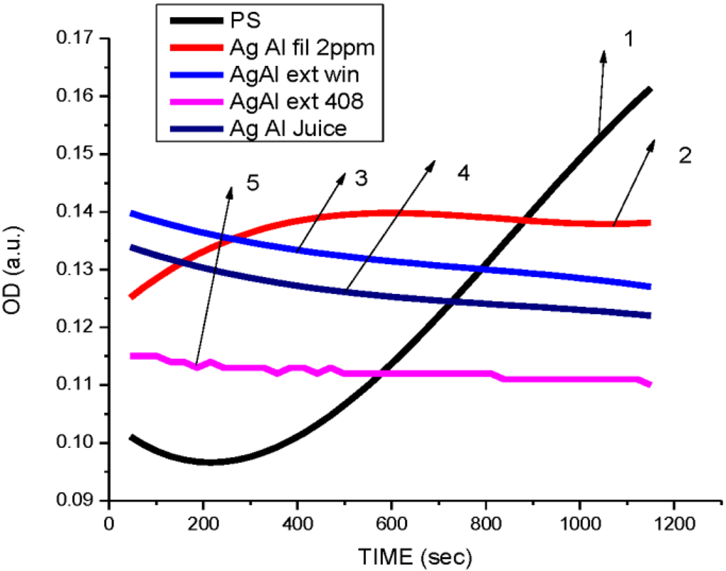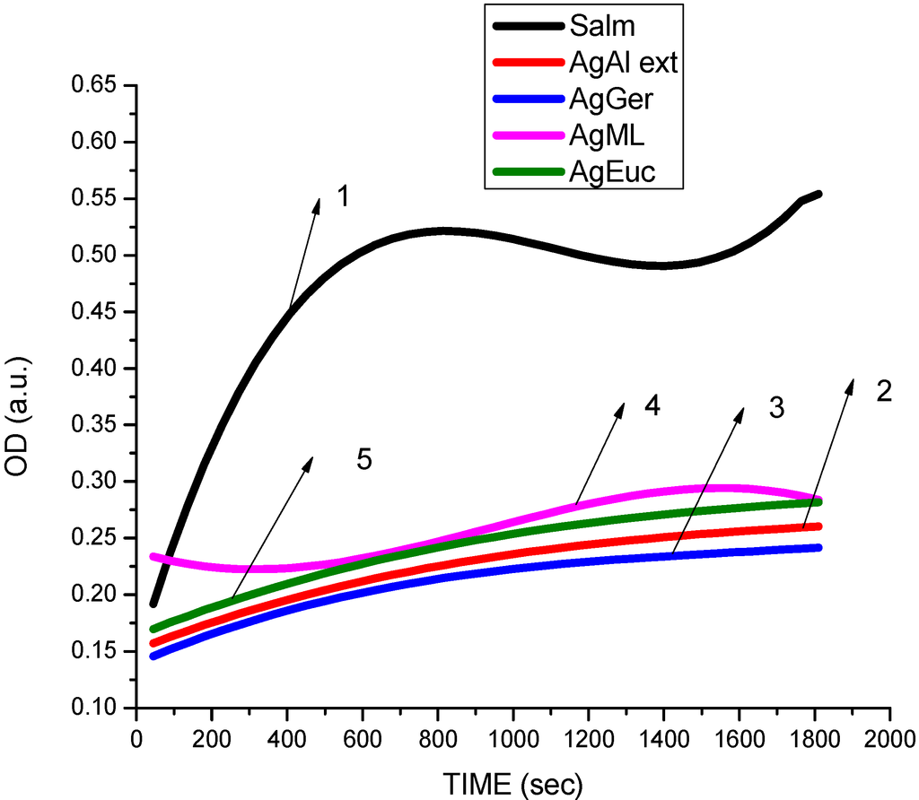 Dependence optical density on time of Salmonella—Gram-negative bacteria treated with AgNPs reduced by various plants leaves. (1) Untreated Salmonella. (2) Treated with 10 µL, 4 ppm AgNPs produced by aloe leaves ethanol extract. (3) Treated with 10 µL, 4 ppm AgNPs produced by Geranium leaves water extract. (4) Treated with 10 µL, 4 ppm AgNPs produced by Magnolia leaves water extract. (5) Treated with 10 µL, 4 ppm AgNPs produced by Eucalyptus leaves water extract.