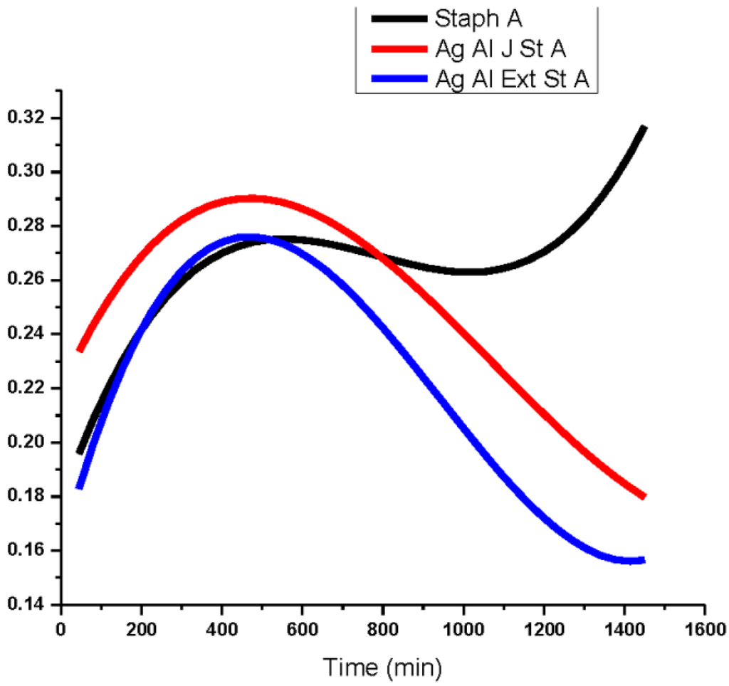 In order to determine the dose response effect of the silver nanoparticles, both Gram-positive and Gram-negative bacteria were exposed to two different concentrations of silver nanoparticles (2 ppm and 4 ppm). An optical density (OD) curve was generated based on the turbidity measurement over a period of 24 h. During the experiment, data were exported to a PC in MS Excel. Microbiological calculations were generated directly to MS Excel sheets automatically. Measurements were then processed to generate microbiological growth curves, plotting turbidity vs. time [].