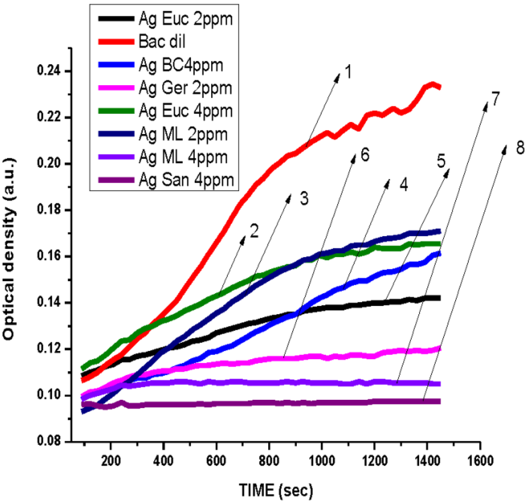 Dependence optical density on time of Bacillus—Gram-positive bacteria treated with AgNPs reduced by various plants leaves, (1) Bacillus—no treatment, (2) Treated with 10 µL, 4 ppm AgNPs produced by Eucalyptus leaves water extract. (3) Treated with 10 µL, 2 ppm AgNPs produced by Magnolia leaves water extract. (4) Treated with 10 µL, 4 ppm AgNPs produced by black cohosh extract. (5) Treated with 10 µL, 2 ppm AgNPs produced by Eucalyptus leaves water extract. (6) Treated with 10 µL, 2 ppm AgNPs produced by Geranium leaves water extract. (7) Treated with 10 µL, 4 ppm AgNPs produced by Magnolia leaves water extract. (8) Treated with 10 µL, 4 ppm AgNPs produced by Sansevieria leaves extract.