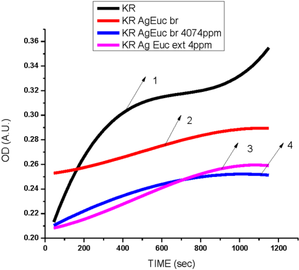 Dependence optical density on time of Kocuria rhizophila—Gram-positive bacteria treated with AgNPs reduced by Eucalyptus plants leaves. (1) untreated Kocuria rhizophila. (2) Treated with 10 µL, 4 ppm AgNPs produced by Eucalyptus leaves water extract. (3) Treated with 10 µL, 4 ppm AgNPs produced by Eucalyptus leaves water extract (AgNPs size 2–8 nm, Figure 5(a,b)) (4) Treated with 10 µL, 4 ppm AgNPs produced by Eucalyptus leaves ethanol extract.