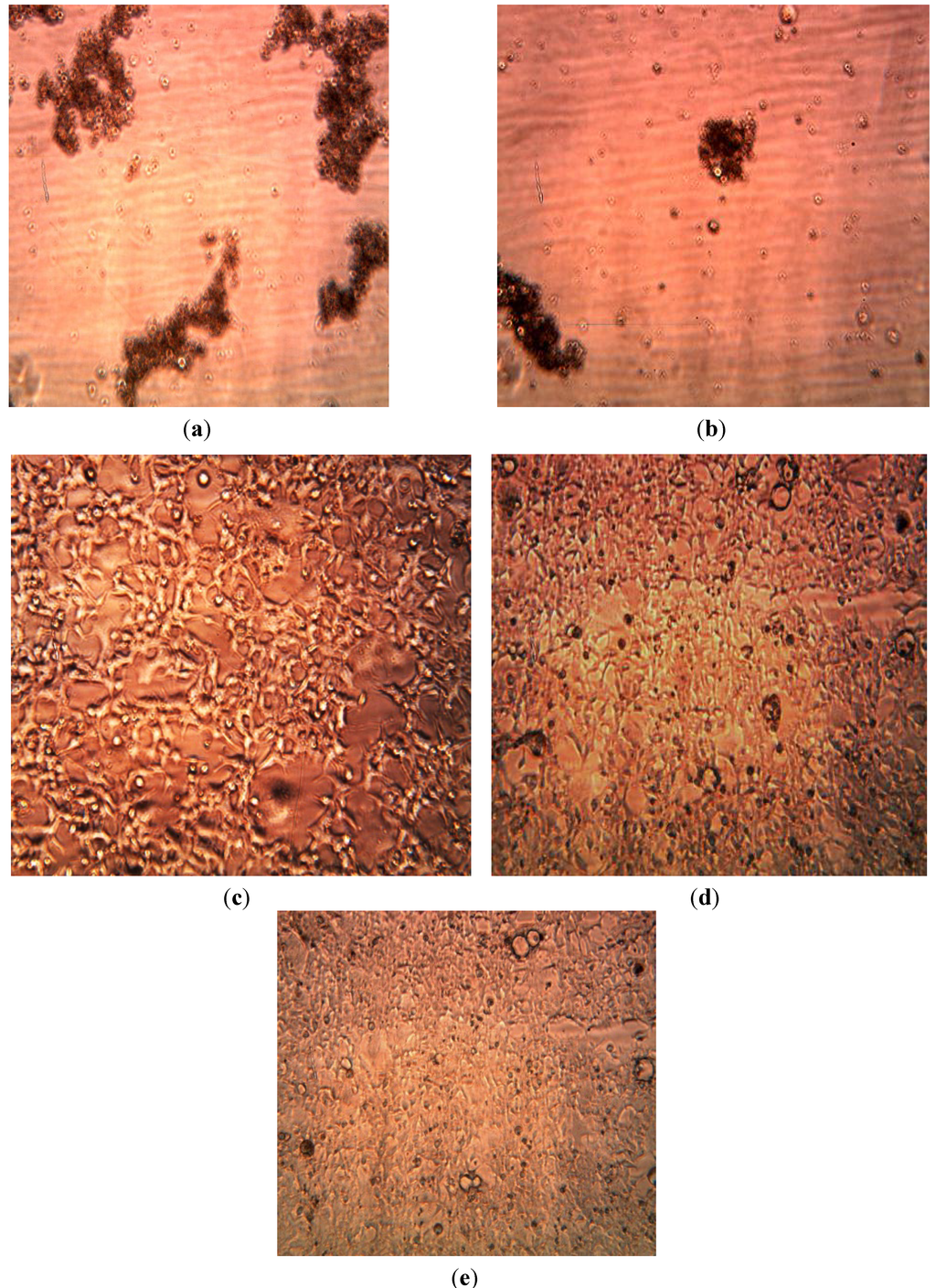 Images of HEK 293 cells. (a) 6 h after Aloe ethanol extract injection. (b) 48 h after Aloe ethanolic extract injection. (c) 6 h after Aloe extract-produced AgNPs, (d) after 36 h, (e) after 48 h.