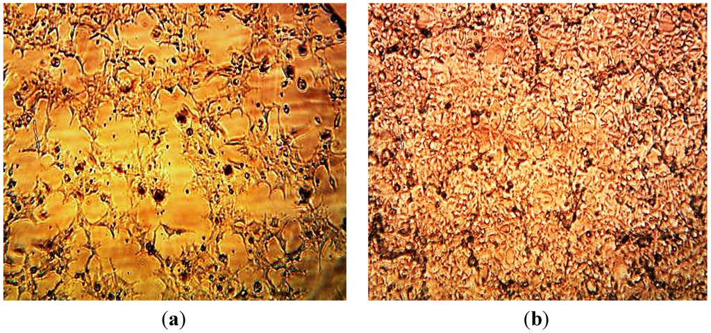 Images of HEK 293 cells: (a) 6 h after injection of 4 ppm AgNPs reduced by Eucalyptus extracts (b) Images of HEK 293 cells: 48 h after injection of 15 ppm AgNPs reducing by Eucalyptus ethanol extract.