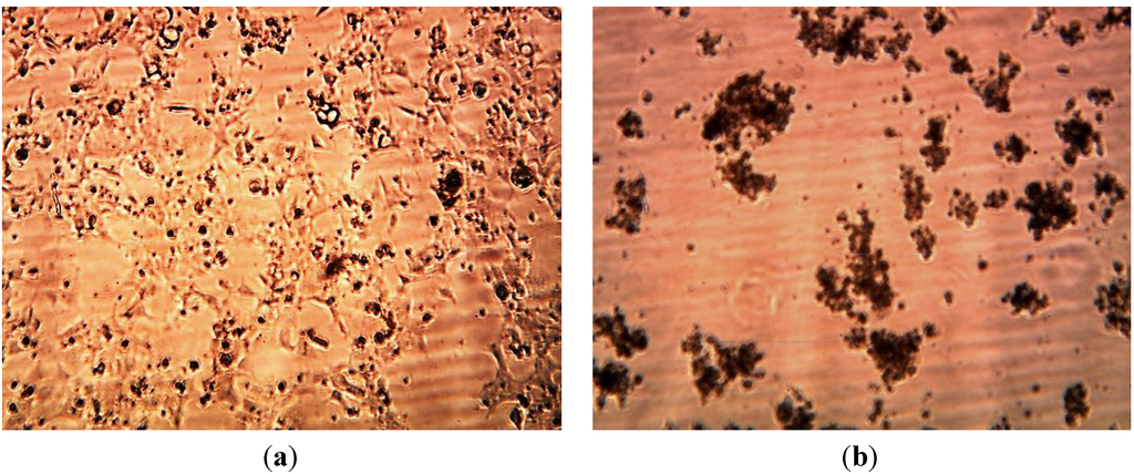 Images of HEK 293 cells: (a) 6 h after injection of 4 ppm AgNPs reduced using Eucalyptus extract. (b) 48 h after injection of 4 ppm AgNPs.