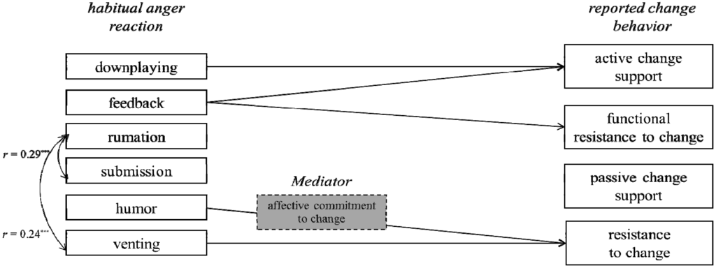 - Active change support is more likely when employees habitually tend to give feedback when angry (2a)—if feedback is welcome in the organization in question. Habitually reappraising anger by reacting humorously to anger evoking situations (2b) or by downplaying the incident (2c) are also predicted to have a positive influence on active change support. All influence on active change support are be mediated by commitment to change (2d).