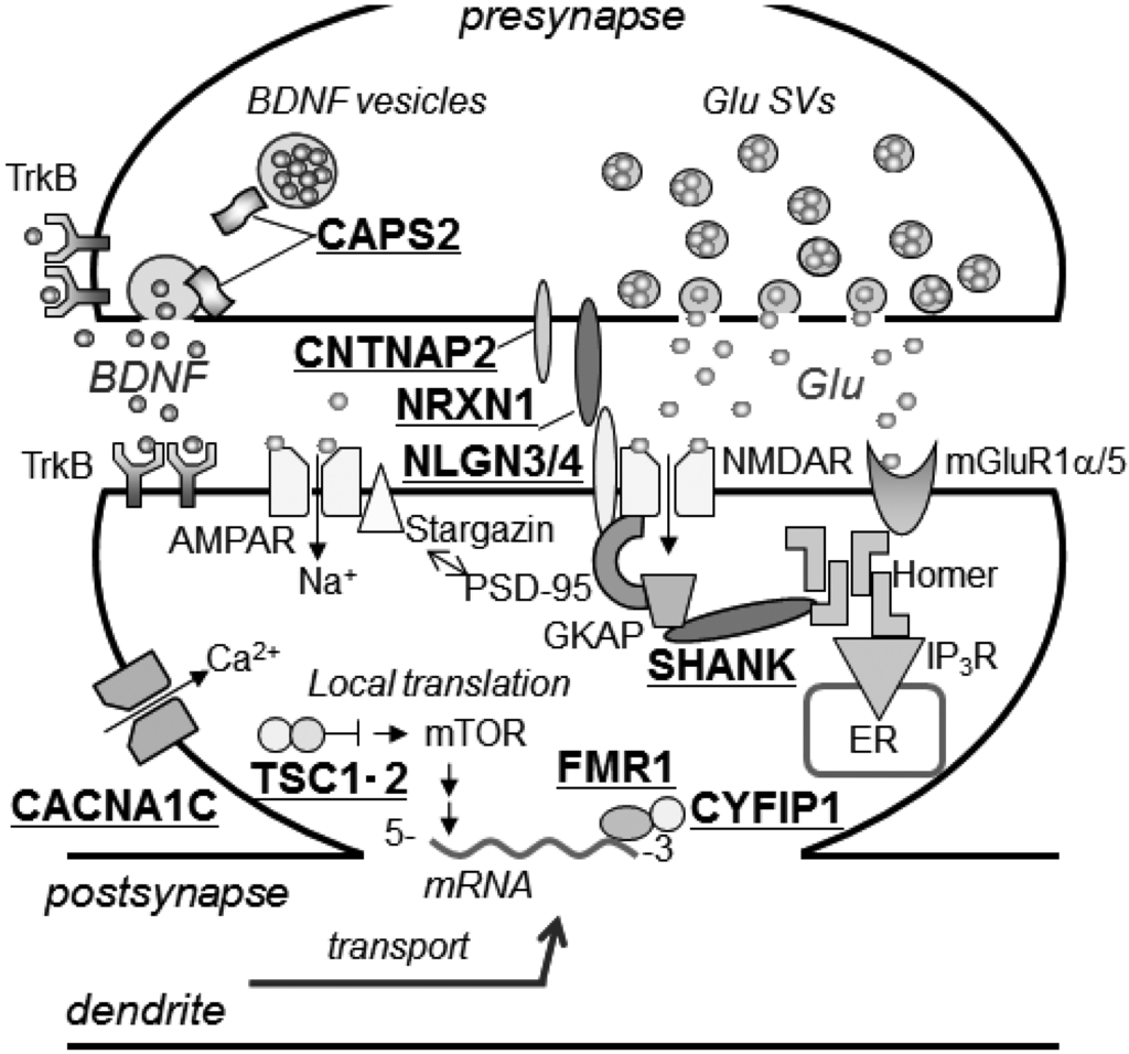 Many ASD-associated genes and gene candidates are involved in synapse function and structure. ASD-associated genes and gene candidates (indicated by underlining) are involved in synaptic connections, synaptic transmission, synaptic plasticity, activity-dependent gene expression, and local translation in synapses.