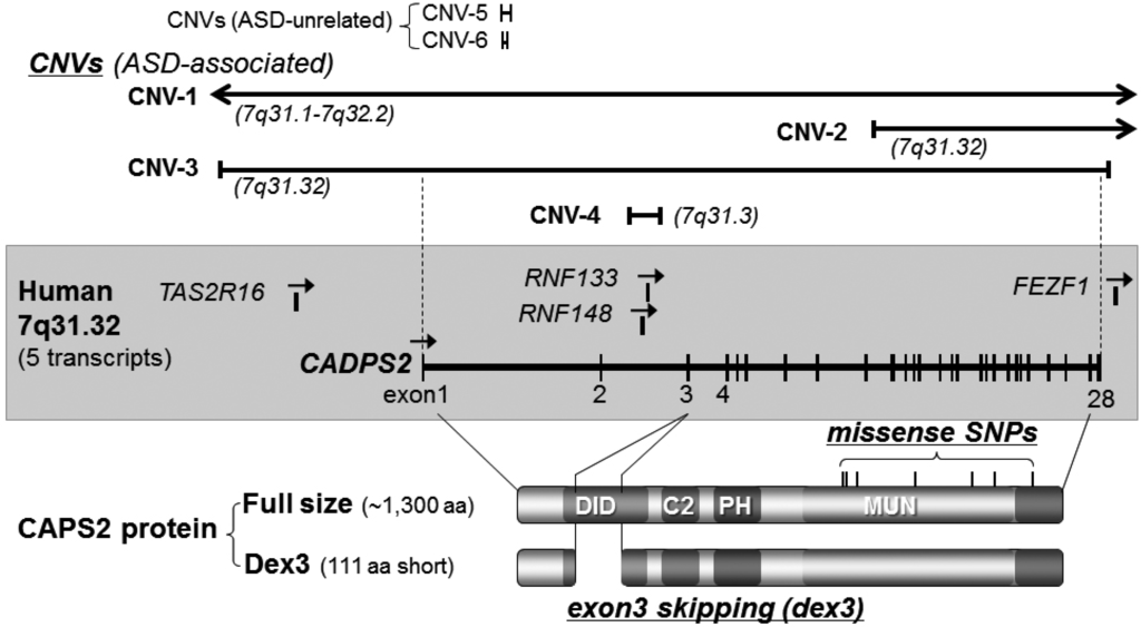 Protein and genomic structure, single-nucleotide polymorphisms, and copy number variations of human CAPS2/CADPS2. Bottom, CAPS2 protein structure. There are several alternative splicing variants in mice (see Table 3, [43]). In mouse brain, the major form of CAPS2 protein (full) consists of approximately 1300 amino acid residues (1275–1355 aa). Increased expression of a rare alternative splicing variant lacking exon 3 (deletion of exon 3, dex3) was found in some patients with autism [43]. Exon 3 encodes 111 amino acids. Seven non-synonymous single-nucleotide polymorphisms (SNPs) have been identified within the human CAPS2/CADPS2 gene. Middle, exon-intron structure of the human CAPS2/CADPS2 gene located on 7q31.32. Five transcripts (CAPS2/CADPS2, TAS2R16, RNF148, RNF133, and FEZF1) have been annotated in this region, although CAPS2/CADPS2 is the only gene with an exon-intron structure and characterized to be expressed as a functional protein. Top, examples of copy number variations (CNVs) affecting CAPS2/CADPS2 on 7q31.32 (for details, see Table 2). Regions affected by six CNVs of the deletion type are indicated by solid lines (CNV1-6). CNV 1–4 have been identified in ASD patients, but CNV-5 and -6 have no evidence for a connection with ASD. CNV-3 causes deletion of 0.75 Mb, including four genes (CAPS2/CADPS2, TAS2R16, RNF148, and RNF133) [16]. CNV-2 causes deletion of 0.94 Mb from exon 9 onwards in CAPS2/CADPS2 [39]. CNV-1 deletes 15 Mb, affecting about 50 genes including CAPS2/CADPS2. CNV-4 causes deletion of 0.044 Mb containing intron 2 of CAPS2/CADPS2, and RNF148 and RNF133 [18]. CNV-5 [47] and CNV-6 [48] delete short sequences of intron 1 in CAPS2/CADPS2. Duplication (0.43 Mb) of CAPS2/CADPS2 was also reported in ASD [44] (not shown in this figure).