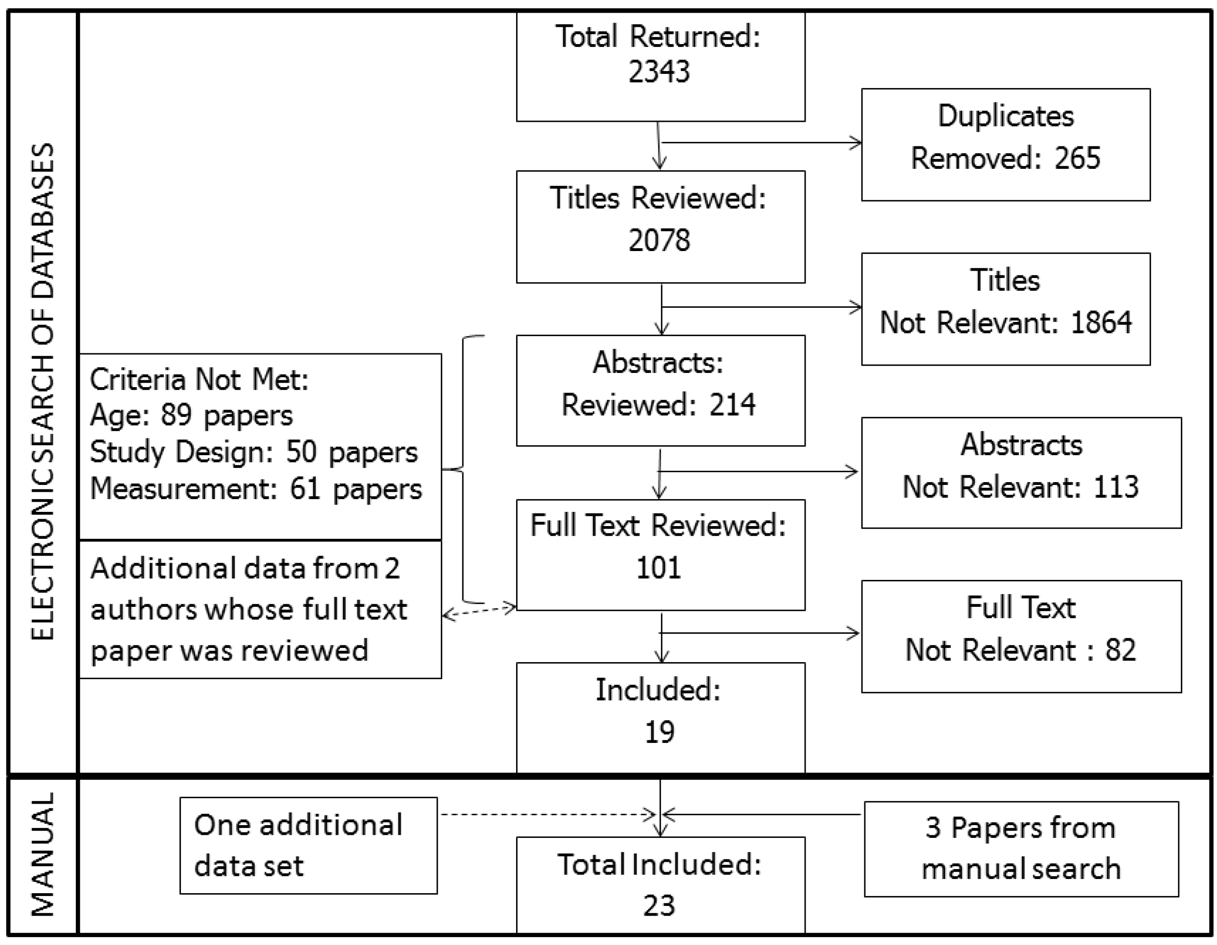 The electronic search returned a total of 2,343 papers (Medline: 732; AMED: 722; CINAHL: 888). After removal of duplicated papers, 2,078 papers were reviewed. The title review excluded 1,864 papers, the abstract review excluded 113 and the full text excluded 82, leaving 19 papers to be included for the study. At the stage of reviewing the full texts, where it was felt that additional information was needed about a particular study, the author was contacted once by e-mail requesting further information. Two included authors (Dunstan [17] and Banks [18]) provided further data sets to support their paper. One more data set was sourced and three papers were highlighted by manual searching. The process of the review resulted in 23 reports of prevalence of sedentary behavior in older adults as illustrated in Figure 1.