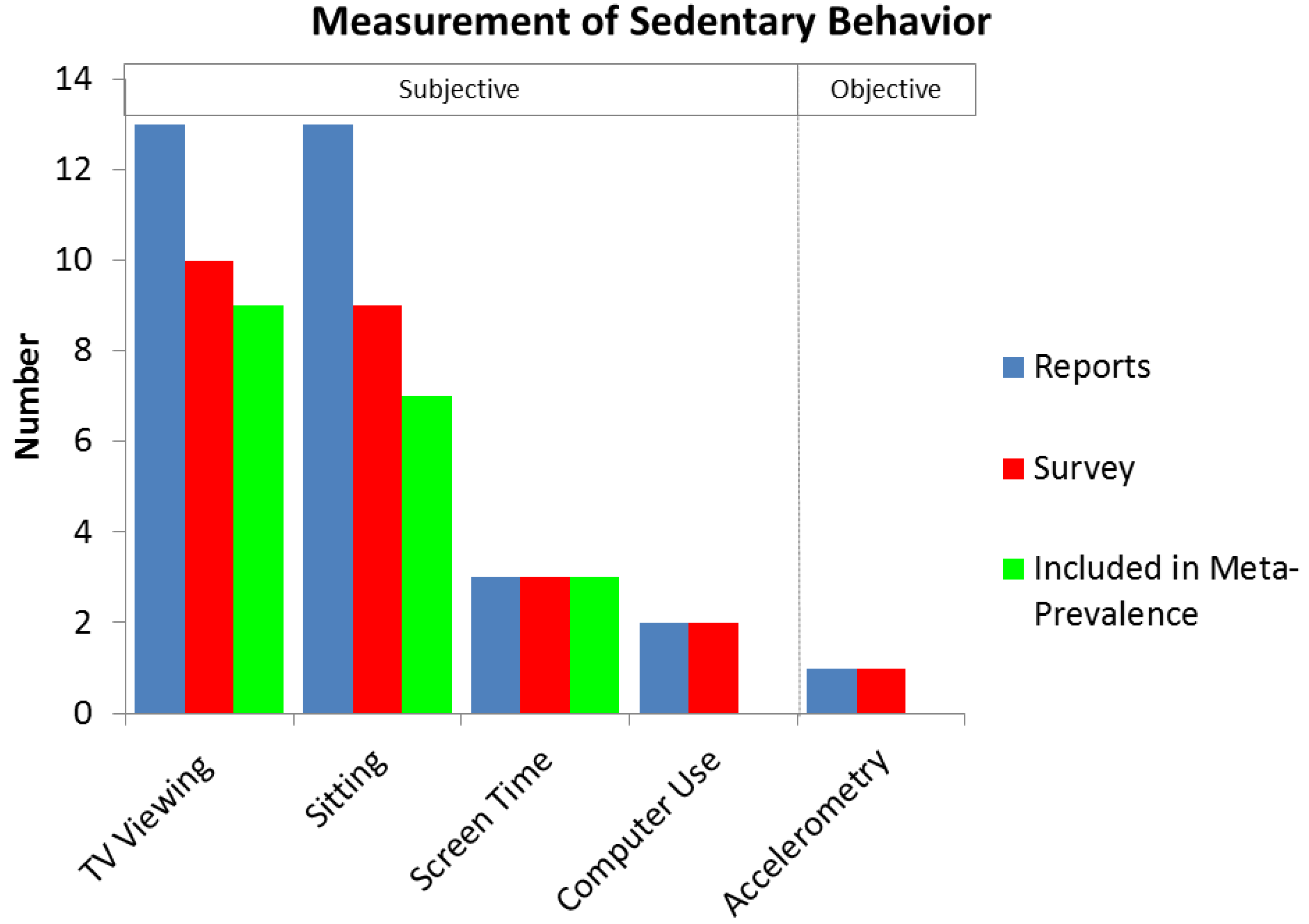 As can be seen from Figure 2, there were 13 papers on sitting, covering nine surveys with seven studies used for the meta-prevalence. With TV viewing 13 papers, covering 10 surveys, nine of which were included in the meta-prevalence. Three papers covered three studies, all of which were included in the meta-prevalence for screen time. Two surveys covered two surveys on computer use and one paper covered 1 survey on accelerometry.