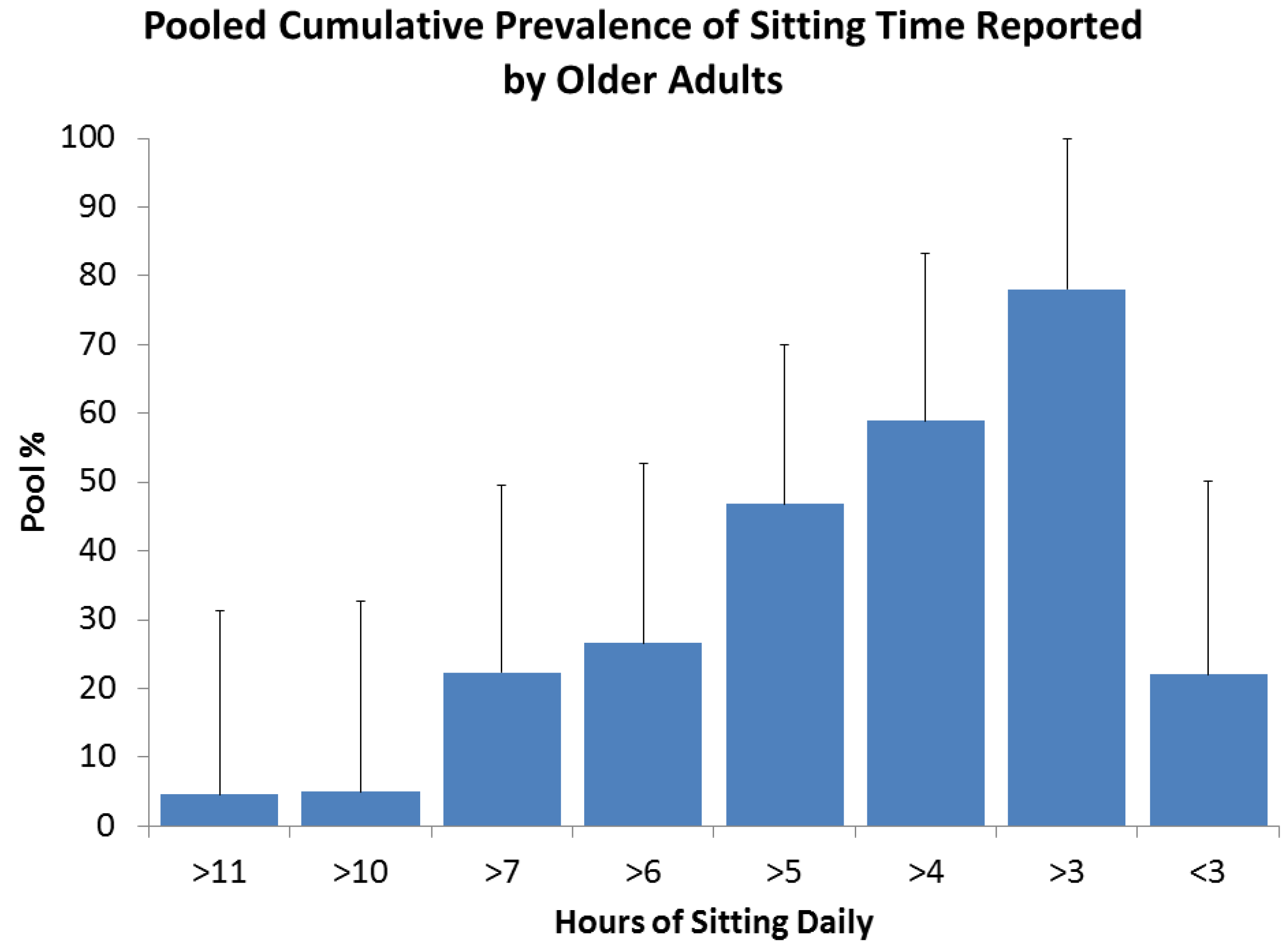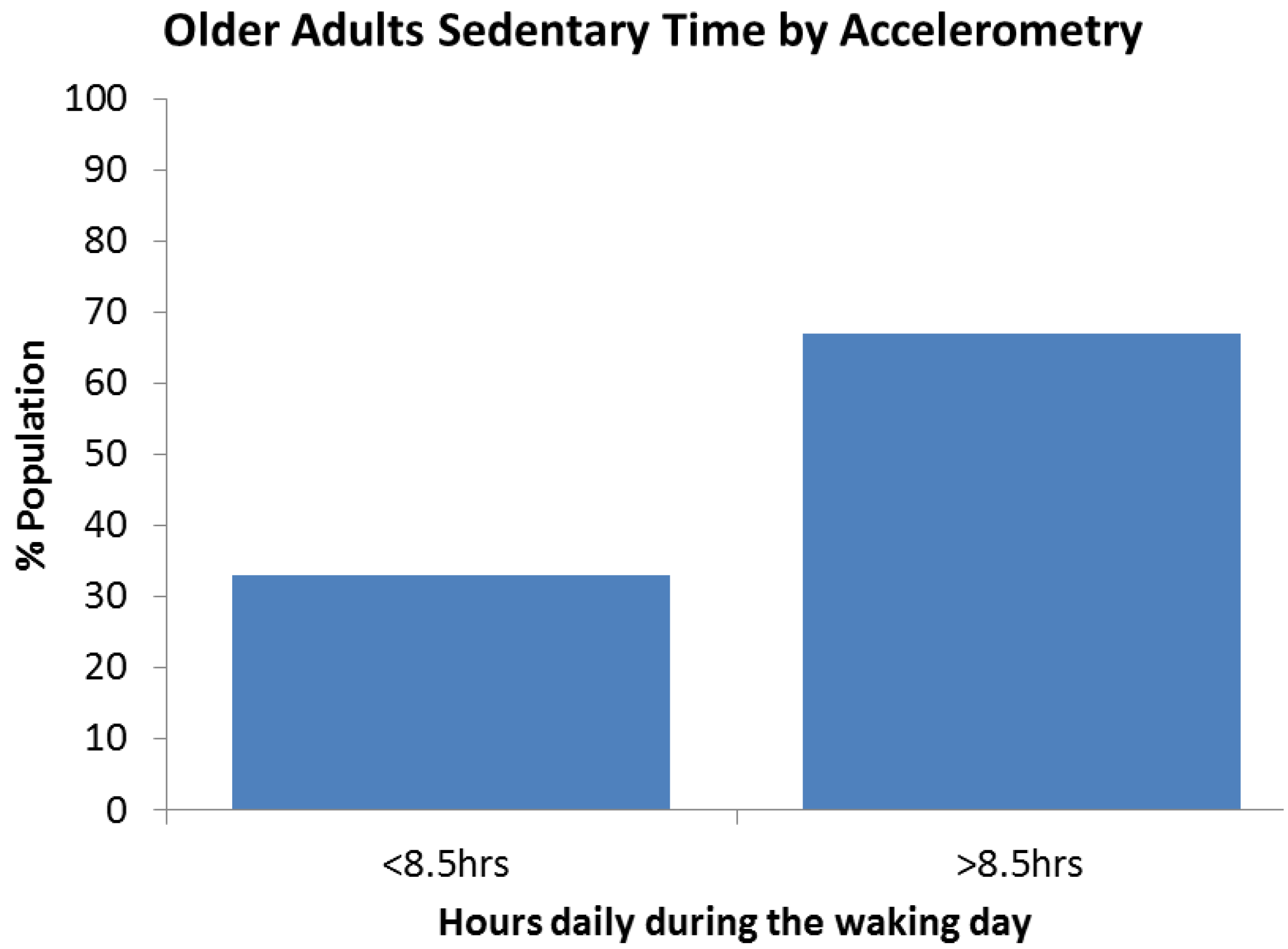 Stamatakis et al. [27] was the only paper to define the prevalence of objective measurement of sedentary behavior in older adults, by accelerometry using activity count. Sixty seven percent of older adults spend over 8.5 h of their waking day sitting or in low energy expenditure. Figure 7 represents the results of 649 English older adults.