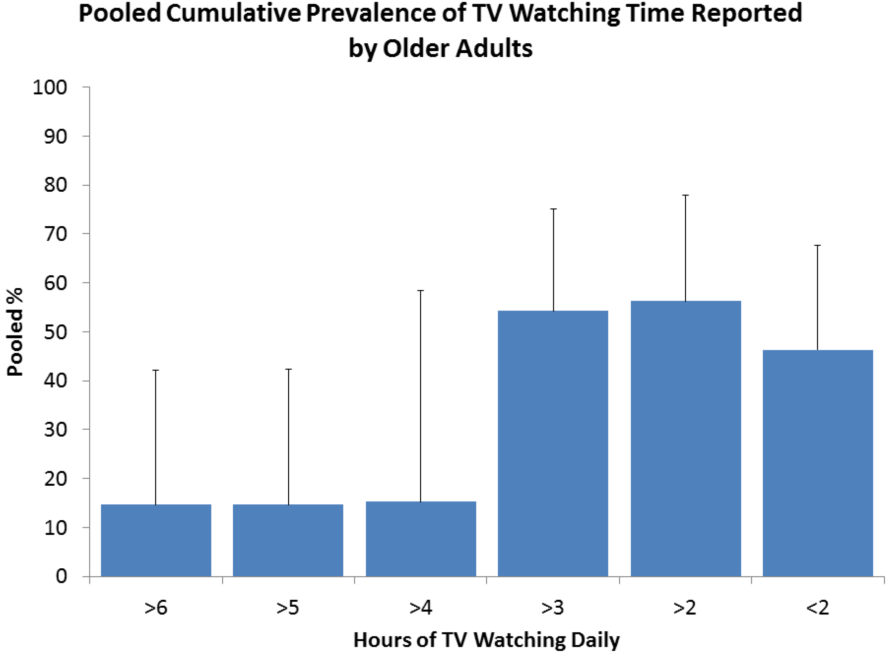 TV viewing serves as a proxy for sedentary behavior, Figure 4 shows the meta-prevalence of TV viewing reported by older adults. These results are reported for a total population of 275,344 older adults, representing nine surveys combining data from Australia, Canada, Japan, Norway, USA and UK [17,19,21,23,24,29,30,33,34]. Fifty six percent of the older population report watching over 2 h of TV per day, 54.2% report over 3 h and 15.1% report over 4 h. The EPIC survey reported by tertiles and found that 32.5% reported TV viewing over 3.6 h per day [16].