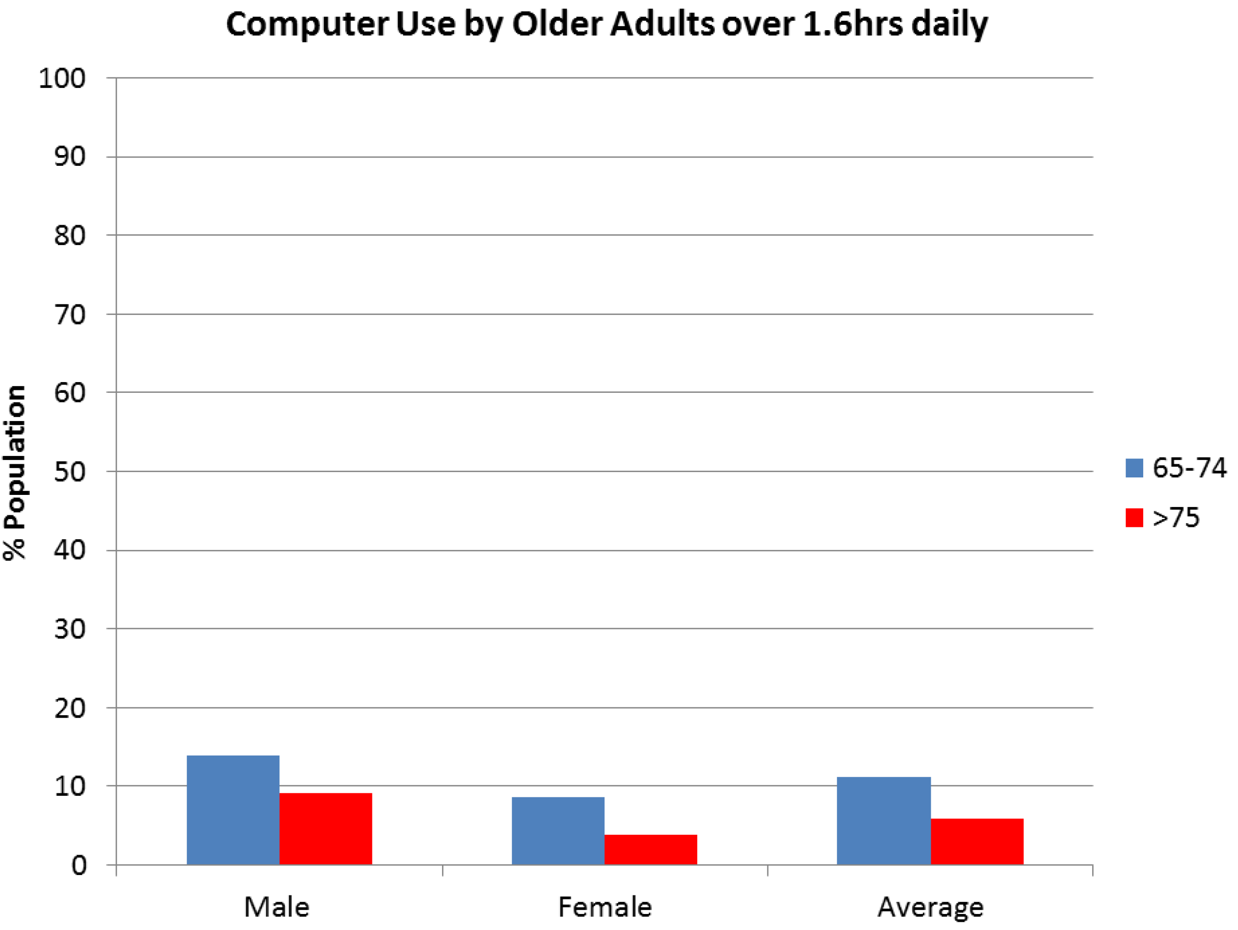 Hamer and Stamatakis [29] reported that 64.6% of older adults in the UK use a computer. Shields and Tremblay [21] provided data on computer use by Canadian older adults, including factors of age and gender for 6,742 participants (Figure 5). Computer use in Canada is relatively low in older adults.Less than 10% of the average older adult uses a computer for more than 1.6hrs daily. Younger older adults use computers more than those over 74 years and the activity is more favored by males.