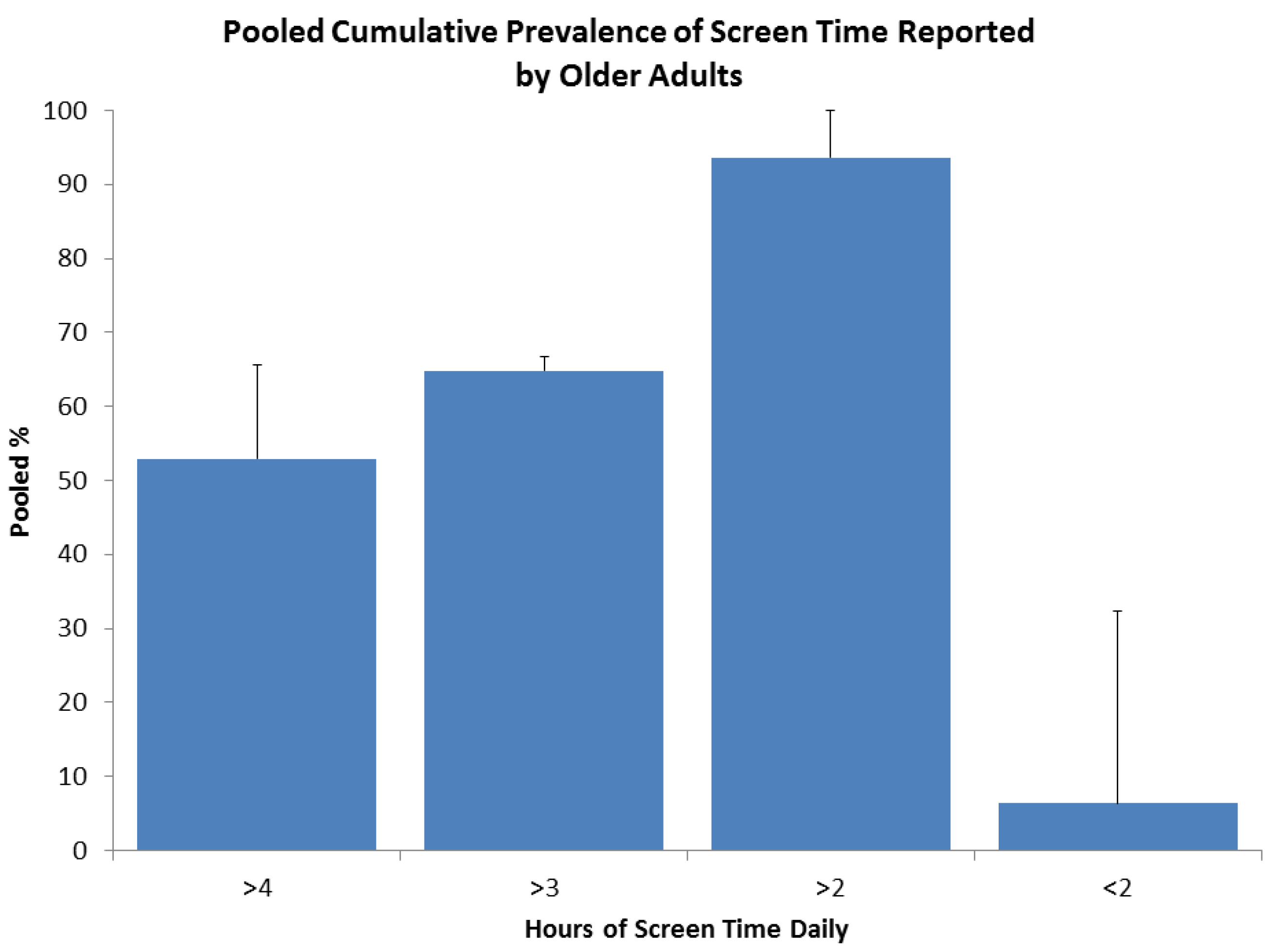 Meta-prevalence of screen time older adults, N = 105,424, n = 3, note <2 (6%) and >2 (94%) = 100%.