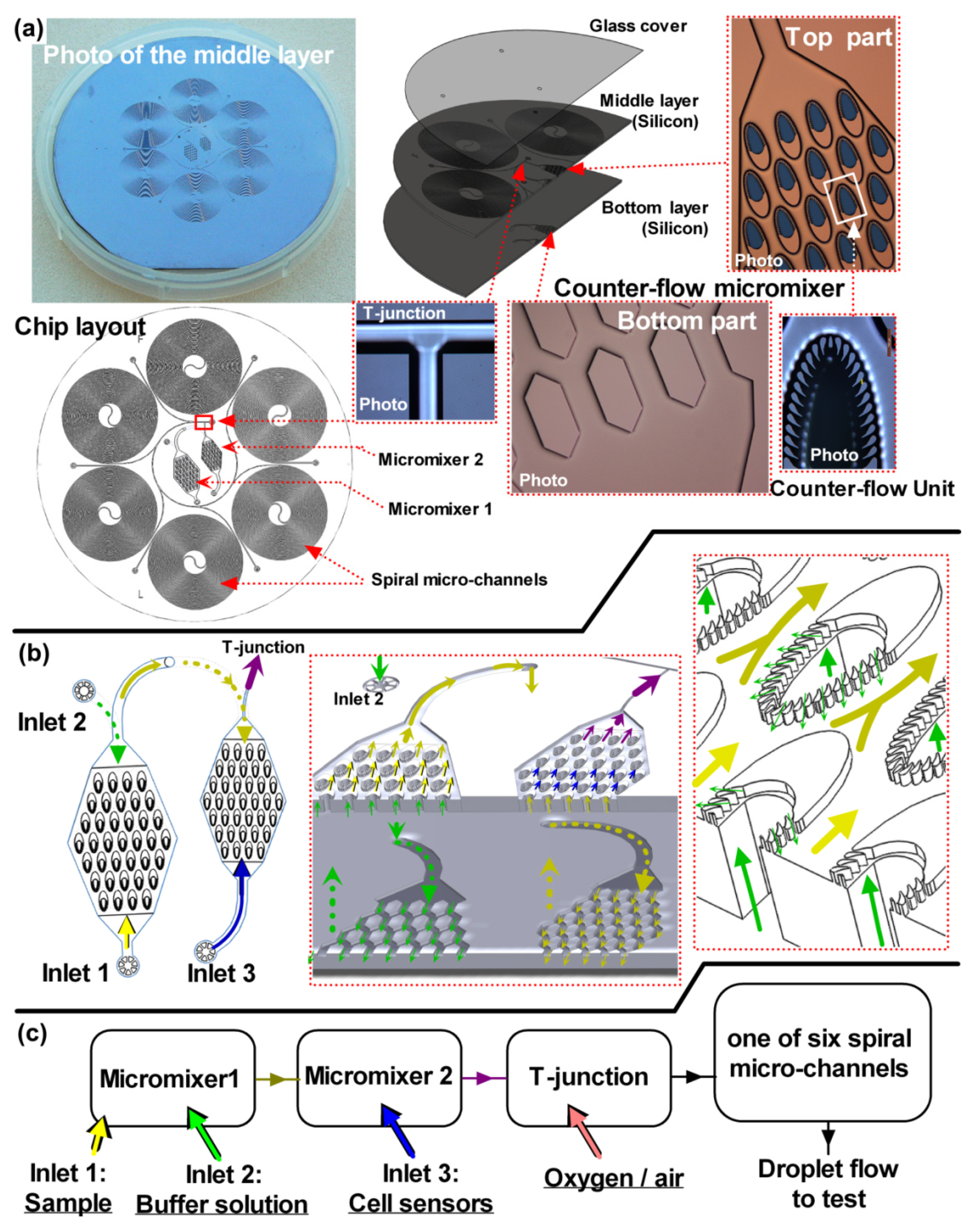 The cell-based chip was composed of three circular layers with diameters of 65 mm (Figure 1). The top layer was a transparent glass cover containing the inlets and outlets. The main structure was integrated within the middle layer. The middle and bottom layers of the chips were composed of 4-inch silicon wafers. There were three domains in the middle layer: the two counter-flow micromixers, the T-junction droplet generator and the six spiral micro-channels with different dimensions.