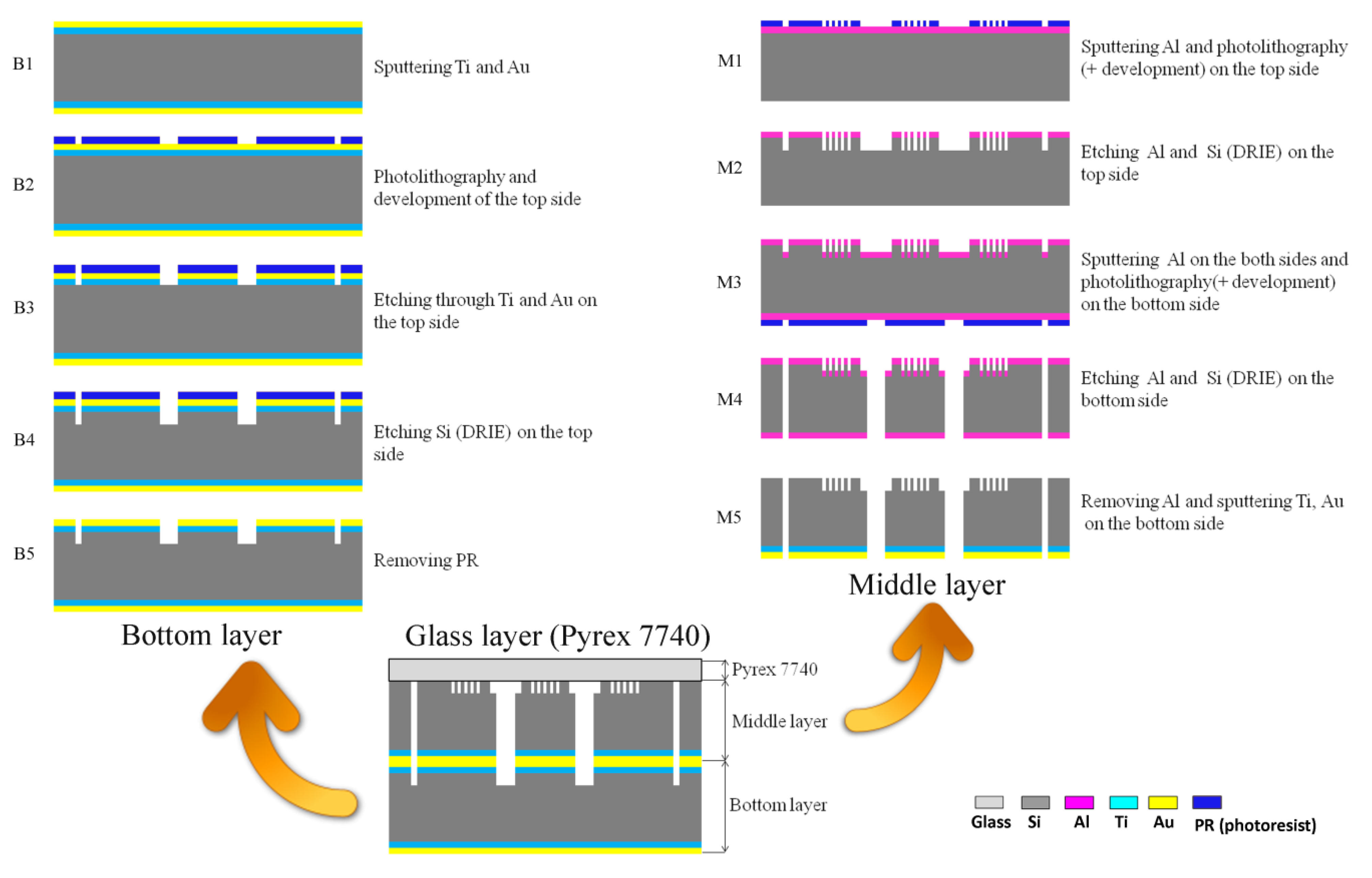 The middle and bottom layers of the chips were fabricated using a previously-done silicon micromachining process [28]. The middle and bottom layers of the chips were made of 4-inch silicon wafers, for which the processing flow is shown in Figure 2. Silicon-glass anodic bonding was performed to covalently bond a Pyrex 7740 glass wafer on top of the middle layer. The holes for the inlets and outlets on the Pyrex 7740 glass wafer were formed by laser ablation before bonding.