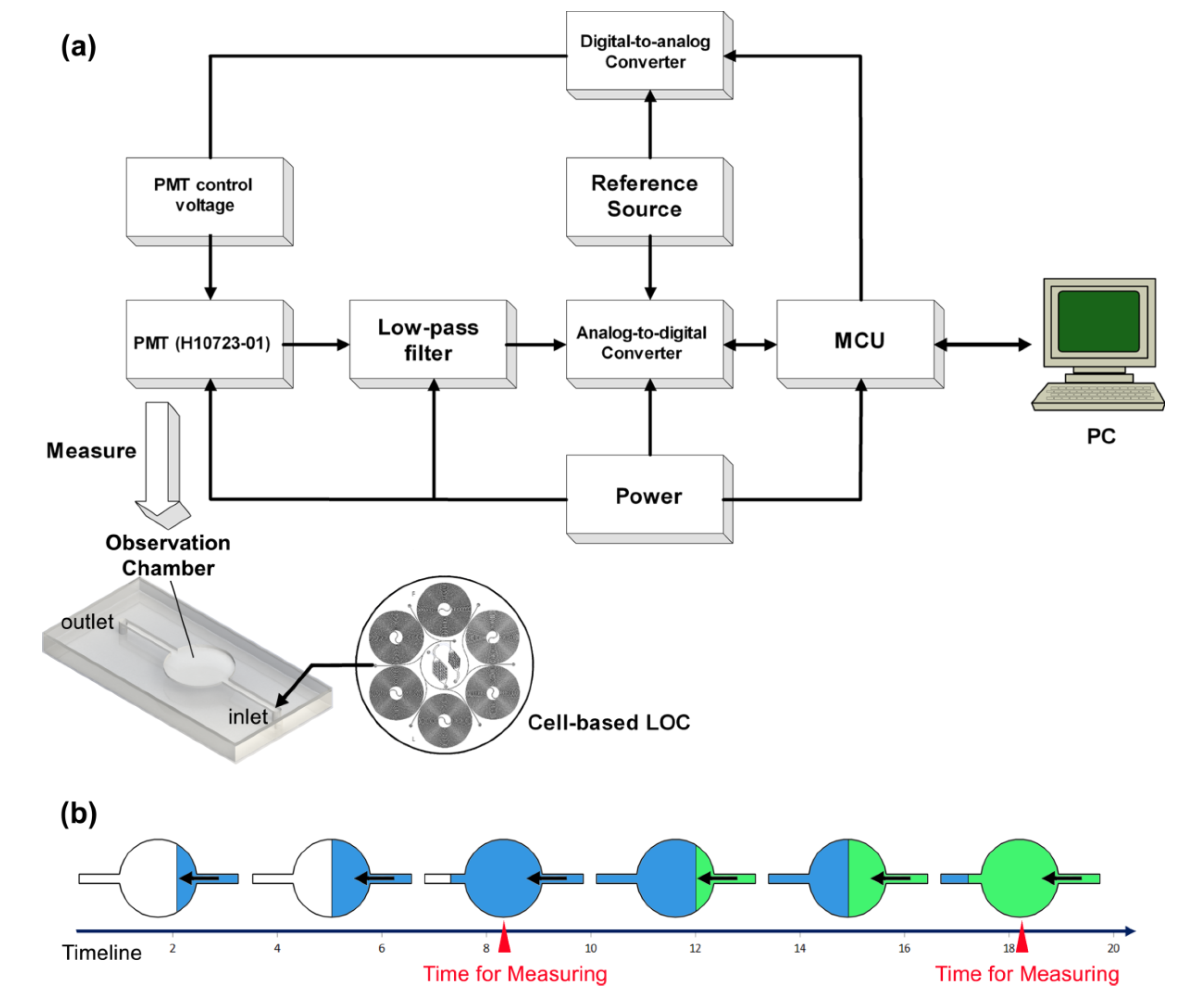 Schematic of the detection system. (a) The droplet flow is generated by the cell-based LOC and moved into the observation chamber. The H10723-01 PMT is located on top of the observation chamber to collect the luminescence. The control voltage of the PMT is programed by a DA converter (Analog Devices, Inc.®). The voltage output of PMT passes through a low-pass filter to improve the signal-to-noise ratio before AD conversion, the activity of which is controlled by a microcontroller unit (Texas Instruments Inc.®, Dallas, TX, USA). The digital signals are transported into a computer (PC) through the USB interface. (b) Dynamic diagram of the observation chamber. The droplets flow from the cell-based LOC through the observation chamber continuously. After a short period, the contents of the observation chamber are totally replaced. Accordingly, the detection system measures the observation chamber periodically.