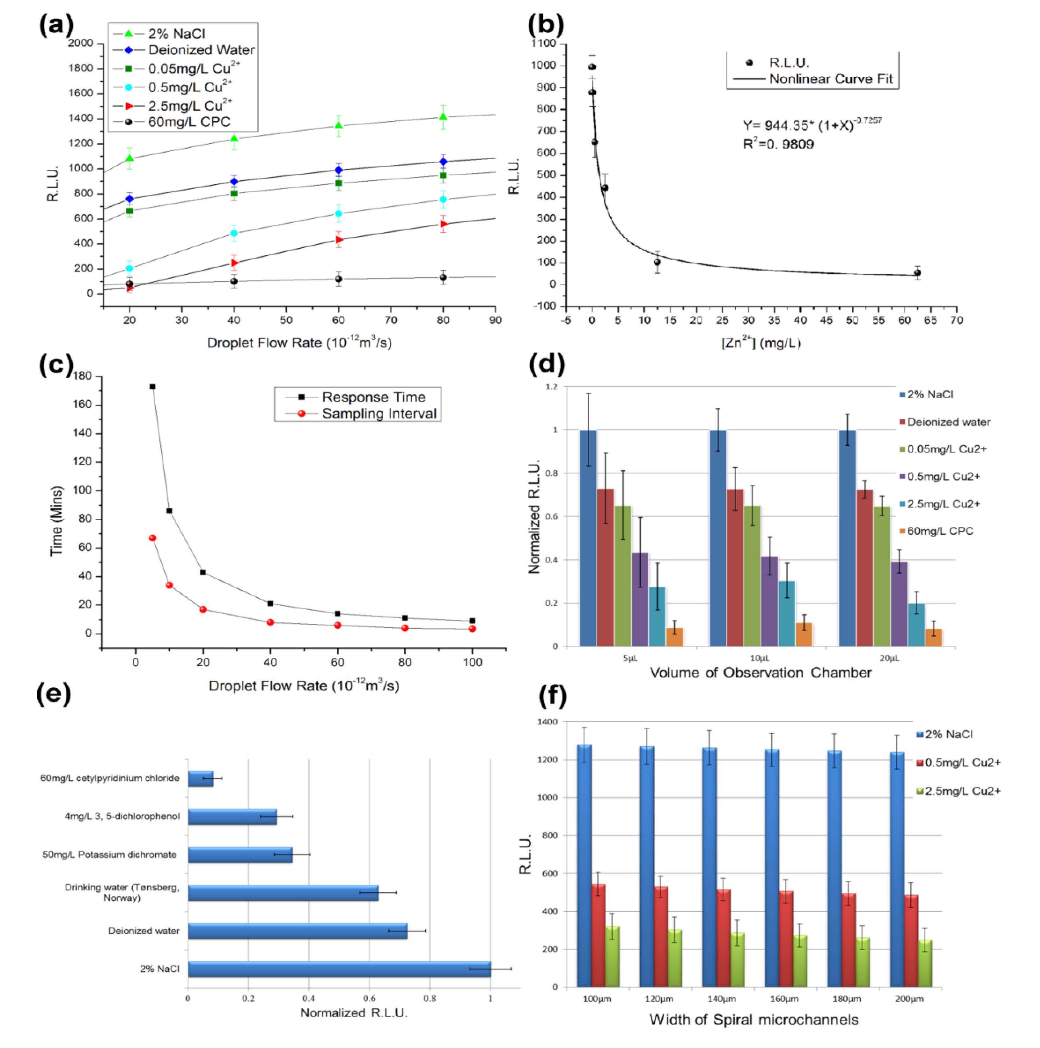 Toxicity test results for the V. fischeri cell-based sensing system. (a) The six sample solutions (2% NaCl, deionized water, 0.05 mg/L Cu2+ solution, 0.5 mg/L Cu2+ solution, 2.5 mg/L Cu2+ solution and 60 mg/L cetylpyridinium chloride (CPC)) were tested at several droplet flow rates [18]. (b) Nonlinear regression between [Zn2+] and the RLU data. (c) Response time and sampling interval of the sensing device. (d) Observation chambers with volumes of 5 µL, 10 µL and 20 µL were tested. (e) The drinking water sample and five artificial solutions were tested in the cell-based system, including 2% NaCl, deionized water, a drinking water sample taken from Tønsberg, Norway, 50 mg/L potassium dichromate, 4 mg/L 3,5-dichlorophenol and 60 mg/L CPC. (f) Parallel tests for the six spiral microchannels.